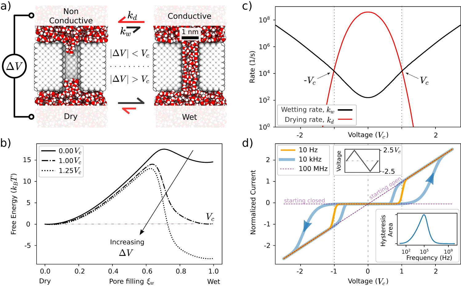 We developed a theory which, backed by molecular dynamics simulations, could predict the effect of voltage on the wetting dynamics of hydrophobic nanopores. Using that framework, we found that due to the deep metastability between dry (non-conductive) and wet (conductive) states, hydrophobic nanopores would have a hysteretic behaviour when an alternating voltage is supplied. This behaviour is the hallmark of memristors.