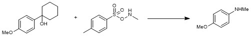 However, safe and easy-to-handle protocols are still needed for direct C-C aminations. Our group presents a metal-free arene C-H amination using arylsulfonyl hydroxylamines (ArSO2ONHR) in HFIP,4 the experience of which makes us believe ArSO2ONHR could be also amenable in C-C amination. First entry using 1-(4-methoxyphenyl)cyclohexan-1-ol and N-methyl-O-tosylhydroxylamine (TsONHMe), delivered the 4-methoxy-N-methylaniline rather than the expected product of a alpha-cleavage of the cyclohexyl ring, 1-(4-methoxyphenyl)-6-(methylamino)hexan-1-one (Figure 1). Following, other secondary/tertiary benzyl alcohols could also be converted into anilines with same strategy. All this makes us believe this C-C amination (so-called aza-Hock rearrangement, Figure 2b, 2c) might go such a rearrangement similar to Hock rearrangement (Figure 2a). We supposed that the electrophilic precursor benzyl alcohol could react with nucleophilic TsONHMe to give the reactive benzyl hydroxylamine intermediate, which might undergo an aza-Hock rearrangement, then hydrolysis of the iminium intermediate delivers valuable anilines.
