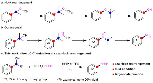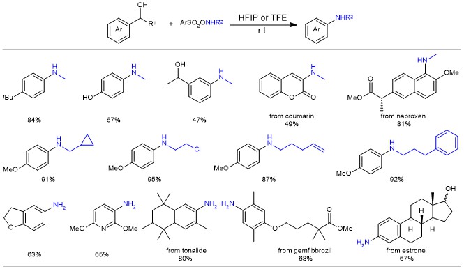 The scope of this C-C amination is striking, and almost all tested benzyl alcohol partners were transformed into anilines in excellent chemoselectivity: not only simple benzyl alcohols but also pharmaceutical and natural products are feasible in the aza-Hock rearrangement; primary/secondary anilines can be afforded with different aminating reagents (Figure 3).