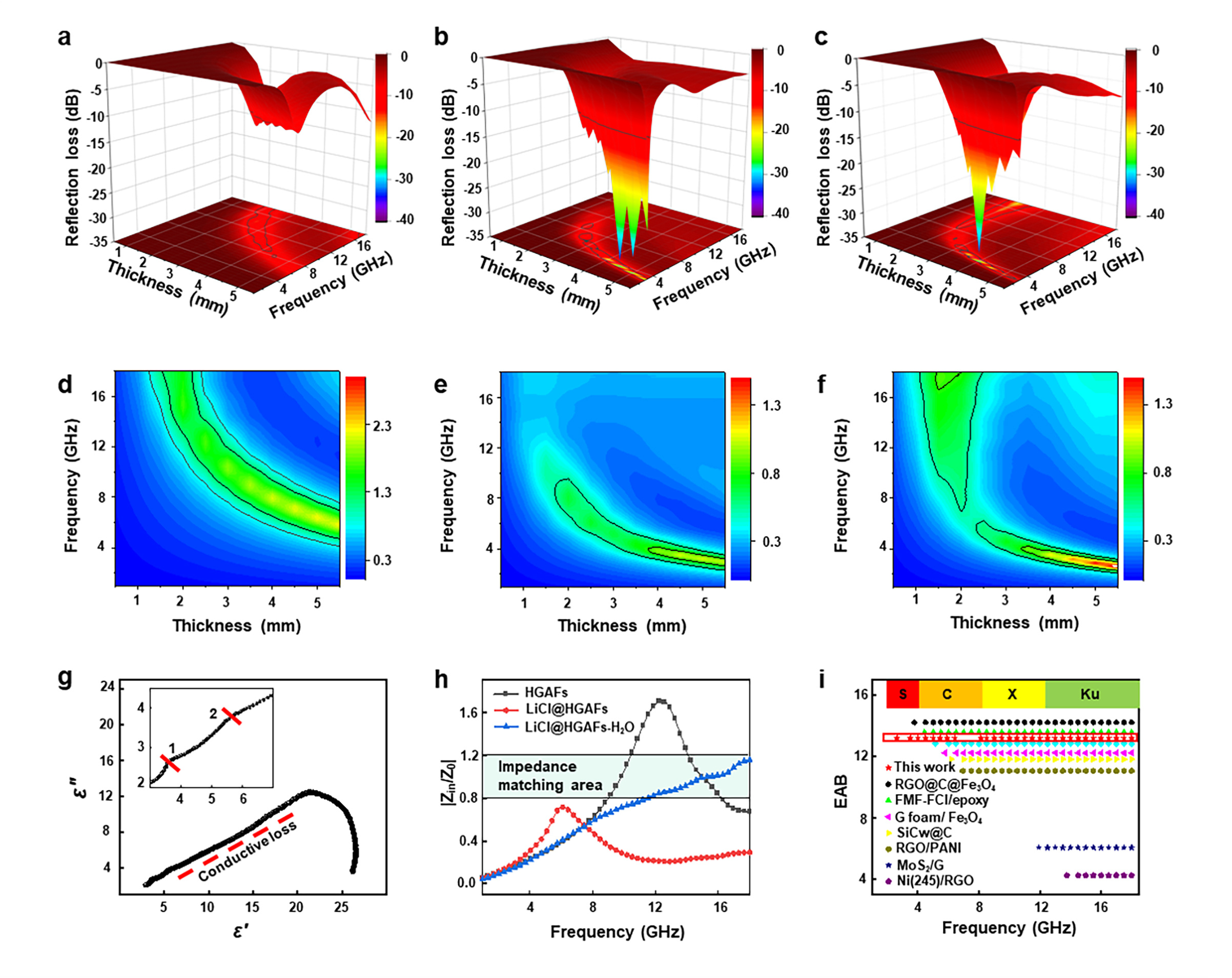 Fig. 4 | Microwave absorption characterization. Reflection loss (RL) value of a HGAFs, b LiCl@HGAFs, and c LiCl@HGAFs-H2O. Calculated |Zin/Z0| values of d HGAFs, e LiCl@HGAFs, and f LiCl@HGAFs-H2O at different thicknesses. g ε′−ε″ plot of LiCl@HGAFs-H2O. h The |Zin/Z0| value of HGAFs, LiCl@HGAFs, and LiCl@HGAFs-H2O with a thickness of 2.5 mm. i The integrated effective absorption bandwidth (EAB) at the scope of 1-18 GHz.