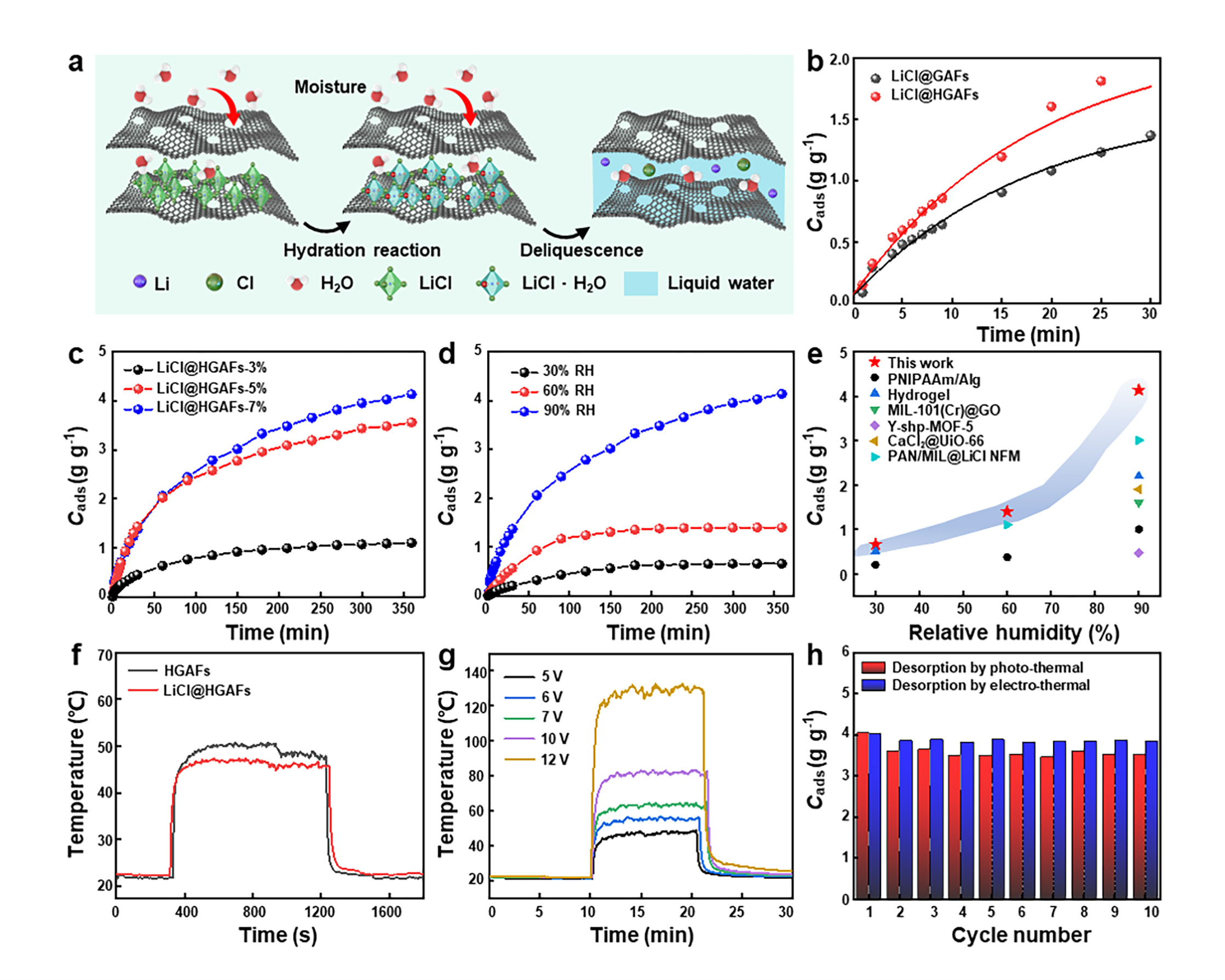 Fig. 2 | High efficient moisture capture by LiCl@HGAFs. a Schematic illustration of the moisture sorption process. In this process, LiCl reacts with water first to form LiCl·H2O, and then deliquesce to form LiCl solution, and the captured moisture exists in the form of liquid water (blue-shaded region). b Water uptake of LiCl@GAFs and LiCl@HGAFs at 25 oC and 90% RH in 30 min. c Water uptake of LiCl@HGAFs with different salt contents at 25 oC and 90 % RH. d Water uptake of LiCl@HGAFs under the relative humidity of 30%, 60%, and 90%. e Comparison of water sorption capacity with reported hygroscopic materials. f Temperature response of HGAFs and LiCl@HGAFs under one-sun irradiation. g Temperature response of LiCl@HGAFs under various voltages. h Cycling stability of the sorption-desorption process of LiCl@HGAFs under photo-thermal or electro-thermal conditions.