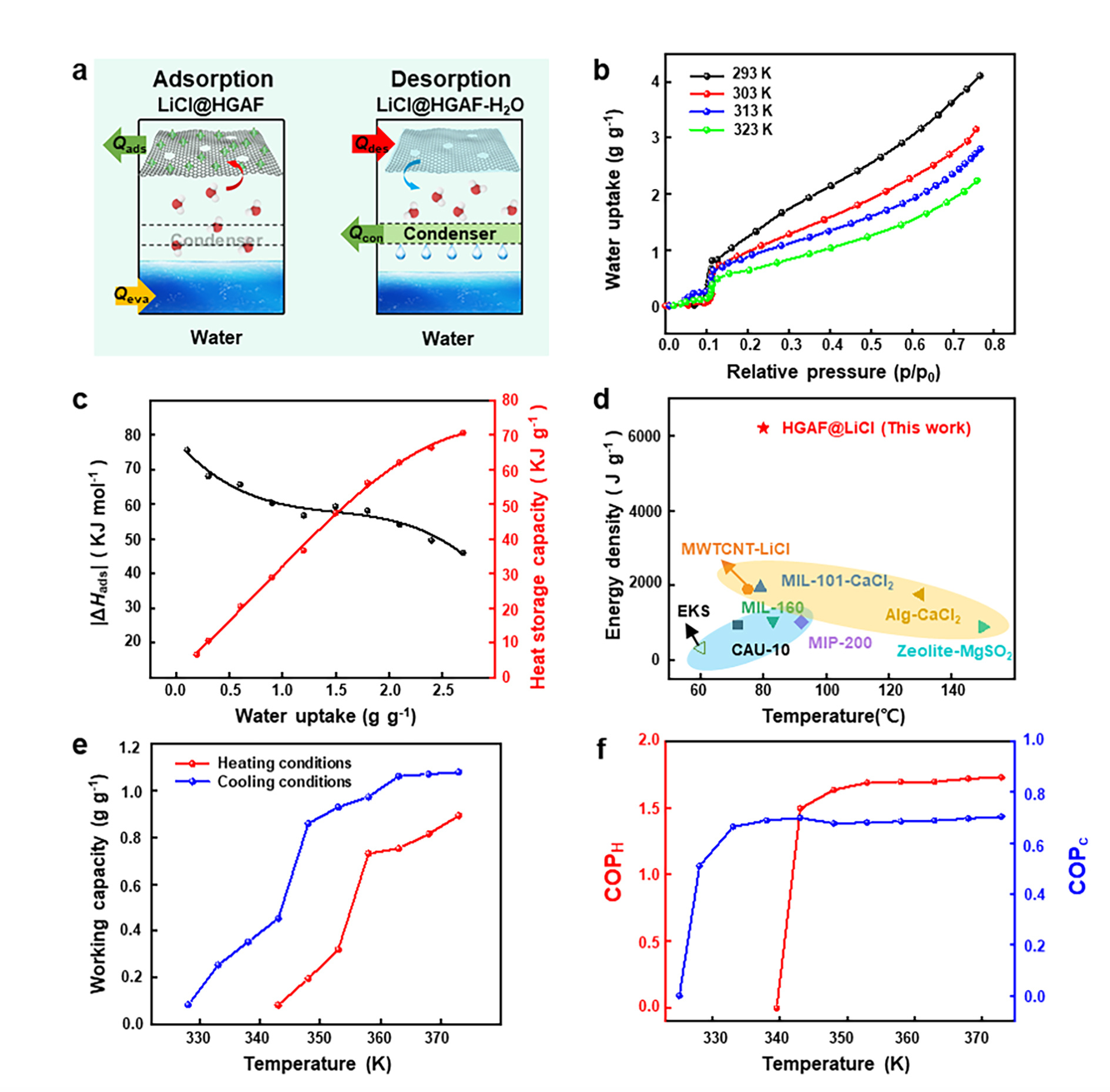 Fig. 3 | Heat allocation of LiCl@HGAFs. a Working principle of LiCl@HGAF in an ATH device. b Water sorption isotherms of LiCl@HGAFs-7 at 293 K, 303 K, 313 K, and 323 K. c Isosteric enthalpy of adsorption for water at LiCl@HGAFs-7 (black) and the corresponding heat storage capacity (red). d Comparison of energy density among our LiCl@HGAF sorbent and other sorbents. e Working capacity as a function of driving temperature for heating conditions. f The COP values for cooling and heating at different driving temperatures.