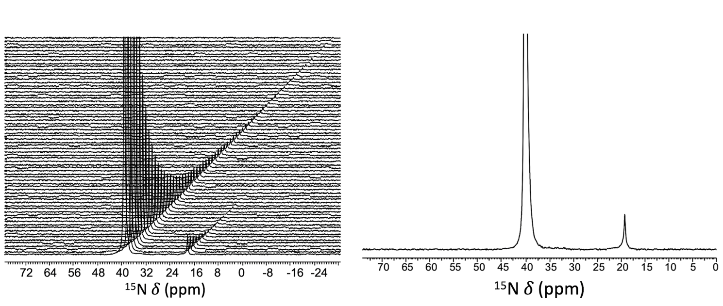 Figure 2. Zinc detection in intact human prostate epithelial cells by hyperpolarized [15N]TPA-d6. Time-dependent 15N spectra collected on a sample of PNT1A cells (left) after adding HP [15N]TPA-d6, and its first 15N spectrum (right).