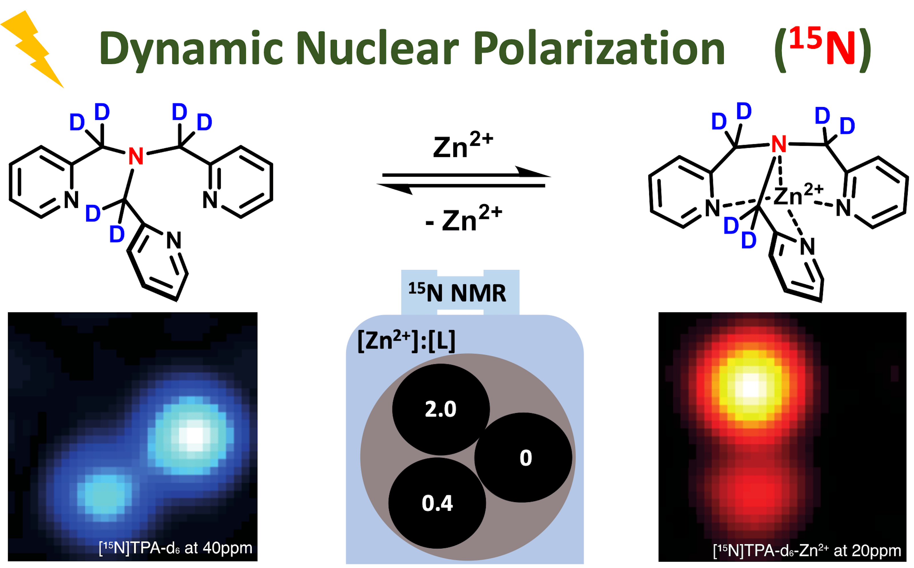 Figure 1. 15N CSI of HP [15N]TPA-d6 in HEPES buffered phantom solutions containing different ratios of Zn2+/[15N]TPA-d6. A diagram of the phantom arrangement (middle), 15N images of free, uncomplexed [15N]TPA-d6(left), images of the Zn2+-[15N]TPA-d6 complex (right).