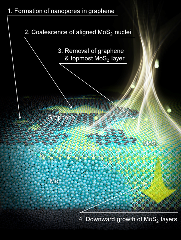 Interestingly, we found a key insight into the origins of hypotaxy during an experiment designed for an entirely different purpose. The initial aim was to employ the sulfurization of molybdenum (Mo) films - one of the simplest methods to synthesize large-area MoS2 - while using graphene as a barrier to block sulfurization in areas covered by graphene. This approach was intended to fabricate patterned MoS₂ structures during synthesis, but it unexpectedly provided critical clues to understanding the hypotaxial growth mechanism. We observed that the Mo was not sulfurized and remained beneath the multilayer graphene as we intended, while in regions covered by a single graphene layer, the graphene disappeared, and a single crystal of MoS2 was formed. The metal chalcogenization process is widely known as a simple method for synthesizing large-area TMDs, but has the problem with typically yielding poor-quality materials, so our unexpected result was surprising. We began to develop this process, termed hypotaxy, by closely observing the growth dynamics under progressively extended sulfurization durations.