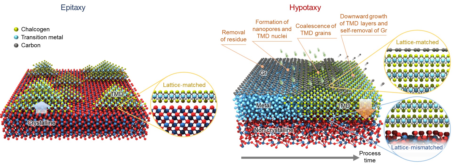 This method achieves precise MoS₂ thickness control from monolayer to hundreds of layers on diverse substrates, producing 4-inch single-crystal MoS2 with high thermal conductivity (~120 Wm-1K-1) and mobility (~87 cm2V-1s-1). These properties are close to theoretical limits or higher than those of exfoliated samples. Additionally, nanopores created in graphene via oxygen plasma treatment allow MoS2 growth at a lower temperature of 400 °C, compatible with back-end-of-line (BEOL) processes. This hypotaxy approach also extends to other TMDs, such as MoSe2, WS2, and WSe2, offering a novel solution to substrate limitations in conventional epitaxy and enabling wafer-scale TMDs for monolithic 3D integration.