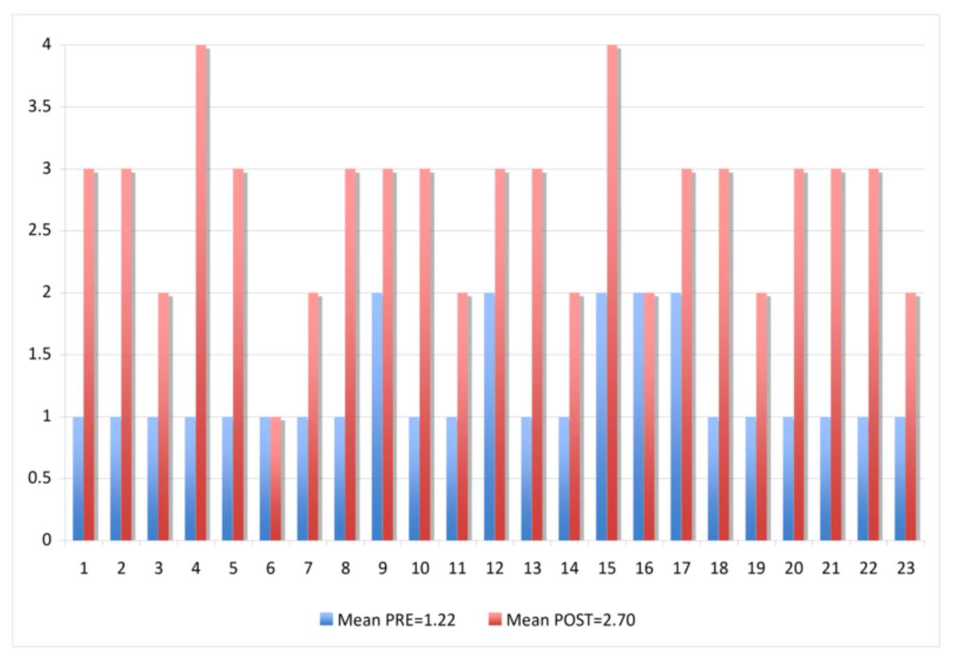 Each student response was scored by my colleague and I, without knowing which responses were “pre” and which were “post.” The scoring data results (shown in the graph below) also indicated changes in student's understanding of the working memory concept.