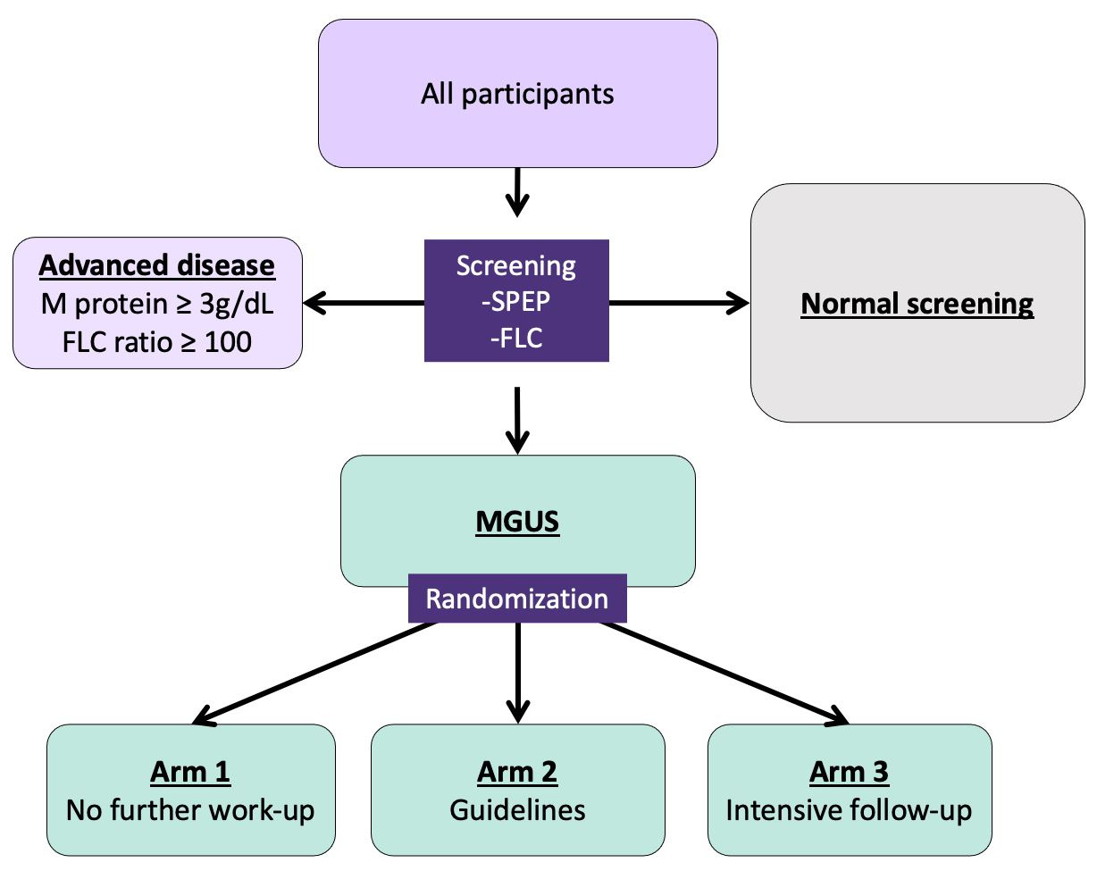Those who have a positive test enter a randomized controlled trial with three arms. Arm 1 is not notified and continues like they were never screened while arms 2 and 3 are called into the study clinic for testing and follow-up of different intensity with arm 2 following current guidelines and arm 3 following a more intensive protocol. This study design is important since the precursor state is present in 4.2% of individuals over the age of 50. These individuals are asymptomatic and a vast majority of them will never develop myeloma or related disorders. That is why it is important to evaluate the harms of screening, especially the psychological harms of knowing that you have a pre-cancerous state. These psychological harms and other important factors are evaluated by questionnaires that are answered by all the participants regardless of screening outcome.