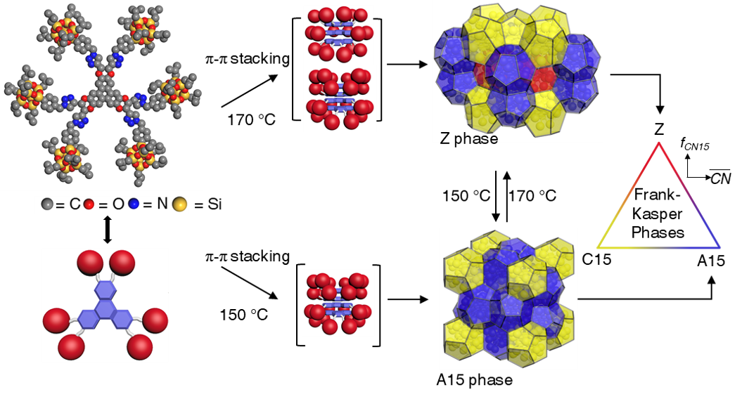 Based on these two principles, we designed and synthesized a series of nano-sized shape amphiphiles, in which a triphenylene core is attached to six polyhedral oligomeric silsesquioxane (POSS) cages at the periphery through covalent linkers with tunable lengths. The relatively weak π-π stacking interactions among the triphenylene cores enable the segregation from peripheric POSS cages. Due to the tunable steric hindrance by the rigid and bulky POSS cages, these nano-sized shape amphiphiles tend to self-assemble into spherical motifs rather than one-dimensional columnar structure. We can finely tune the balance between π-π interactions of triphenylene and the steric hindrance of POSS cages by changing the length of the linkers. The self-assembly of these nano-sized shape amphiphiles result in a variety of highly ordered unconventional supramolecular lattices, including the Z phase with relatively large volume asymmetry (~ 1.33). We also investigated the behaviors and mechanisms of the phase transition between the A15 phase and the Z phase (Figure 1).