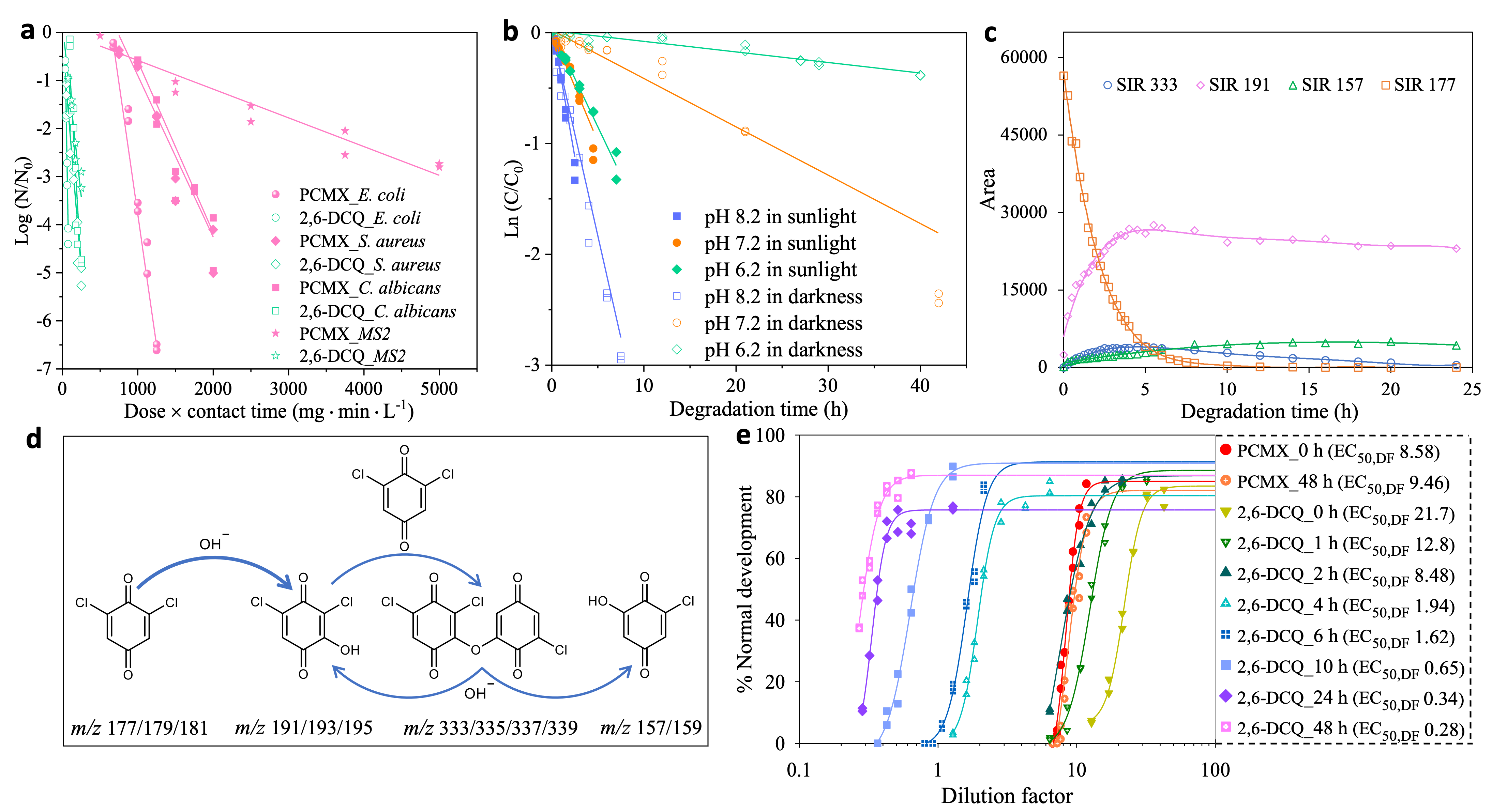 Figure 2. Antimicrobial activity, degradation kinetics and pathway, and developmental toxicity of 2,6-DCQ. a Survivorship of E. coli, S. aureus, C. albicans and MS2 against the dosage of 2,6-DCQ and PCMX at pH 7.2. b Degradation of 2,6-DCQ under different pH conditions with and without solar irradiation. c Peak area variations of 2,6-DCQ and its degradation products with time. d A proposed degradation pathway of 2,6-DCQ in seawater. e Comparative developmental toxicity of 2,6-DCQ and PCMX solutions with different degradation time in darkness.