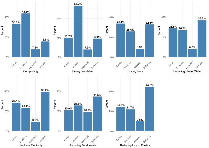 Our survey results show that doubters are a majority when it comes to eating less meat and composting. However, when we look at cynics and doubters together, these two groups constitute a majority on all 7 sustainability behaviors except for two (i.e., reducing food waste and reducing the use of single-use plastics); see Fig 1.