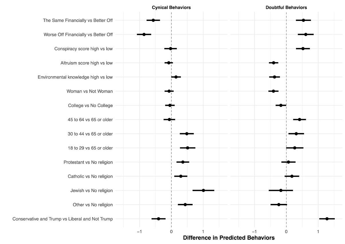 Our regression analysis results show that people who are less well-off financially, who believe in conspiracy theories more, who are less altruistic, who have lower knowledge about environmental issues, who identify as males, who did not go to college, who are relatively younger, and who voted for Trump and identify as more conservative engage in more doubtful behaviors, meaning that they are less likely to engage in sustainable behaviors and less likely to believe these behaviors make a difference.