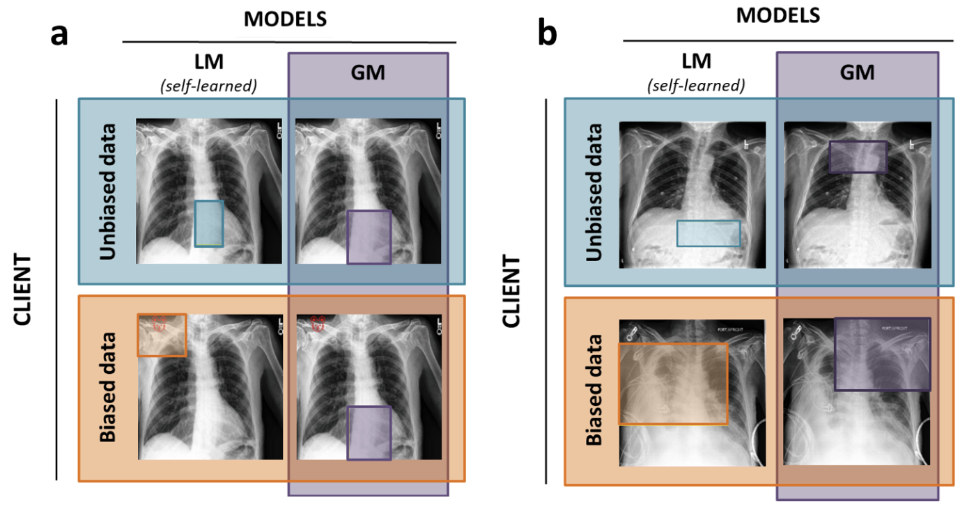 Bias identification with MyTH. Examples of a test image with bounding boxes indicating the most activated patches by the prototypes learned locally and globally on unbiased and biased CheXpert datasets in an FL setting for cardiomegaly (a) and pleural effusion (b) classification. FL setting includes three unbiased and one biased clients. The difference between local (LM) and global (GM) prototypes signals about poor data interoperability in the federation.