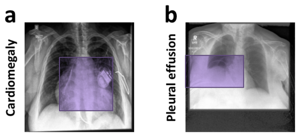 This approach was demonstrated using a benchmark dataset of chest X-rays, focusing on two conditions: cardiomegaly (enlarged heart) and pleural effusion (fluid in the pleural cavity). The figure below gives a schematic overview of our model.