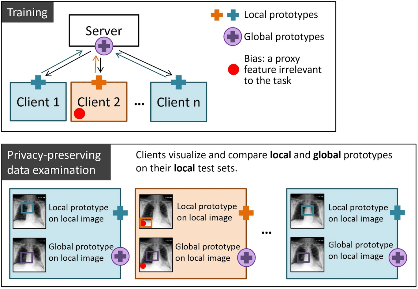 Novel approach to interpretable and privacy-preserving identification of systematic data bias in federated learning. Within one communication round, each client learns local prototypes on its local training set and shares them with a server that aggregates and averages local prototypes from all clients and sends these new global prototypes back to clients. One of the clients has a bias in its data which can mislead the model. After several communication rounds, each client can examine the global data locally by visualizing and comparing local and global prototypes on its private local test set. Hidden bias in the federation results in a large difference between local and global prototypes.