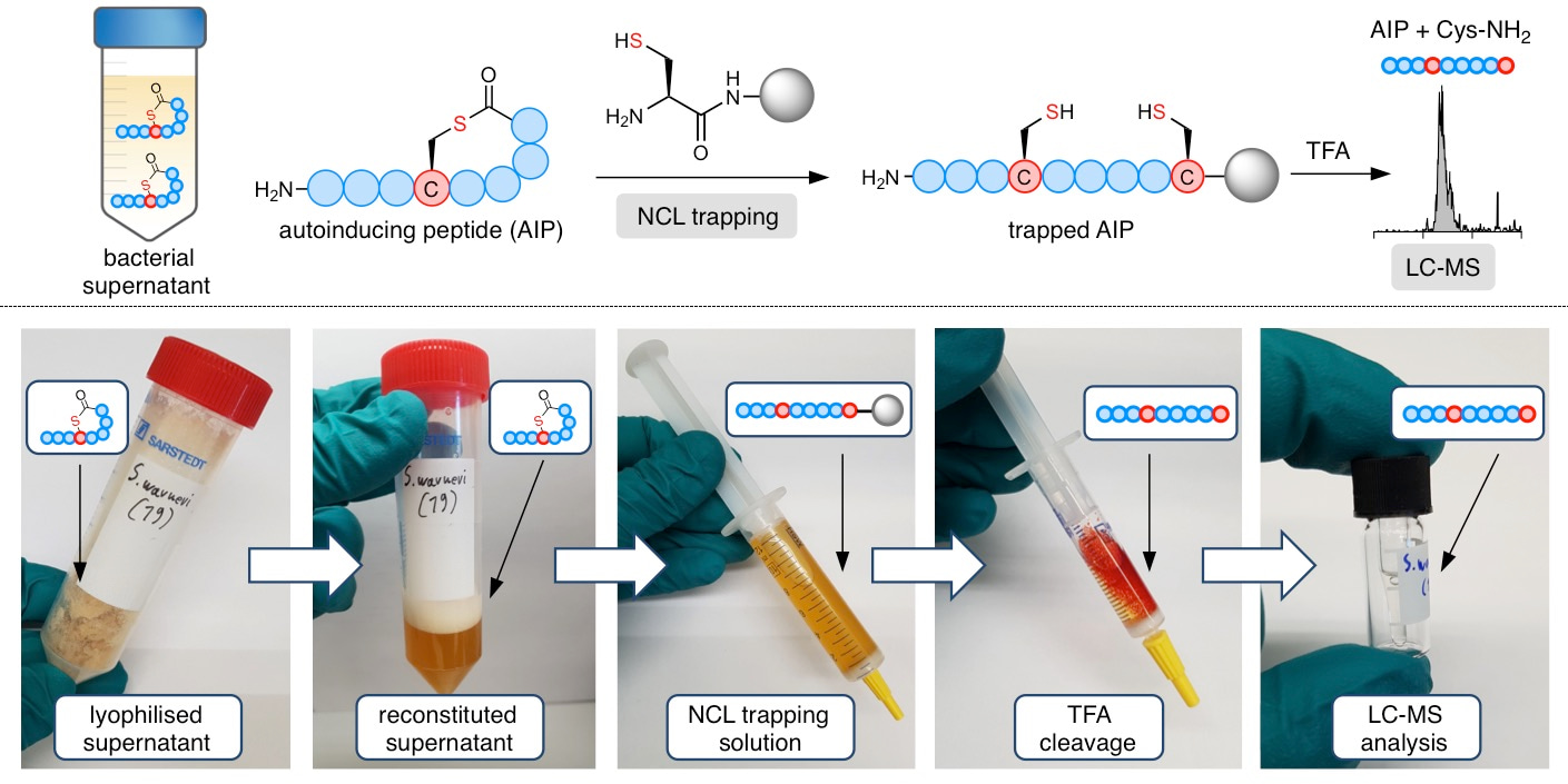 We were therefore keen to come up with a method for identifying the AIP directly from spent medium, but ideally without performing lengthy activity-guided fractionations and HPLC purifications as in traditional natural products chemistry. After failing at detection of the AIP by performing simple extraction procedures, it was envisioned that some sort of enrichment process by binding of the molecule to a solid support might do the trick. This was when the graduate student working on the project, Bengt Gless, thought of native chemical ligation (NCL), which is a highly chemo-selective reaction between an N-terminal cysteine and a thioester (in this case the thiolactone). A simple polymeric resin, functionalized with cysteine, proved highly efficient for trapping synthetic AIP molecules from medium in preliminary experiments, and we were excited to find that expressed AIPs from cultured bacteria could also be enriched and identified by standard LC-MS analysis after cleavage from the resin.