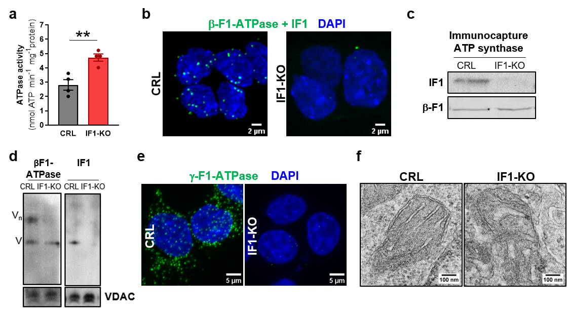 Figure 1. IF1 controls a pool of inactive ATP synthase in mitochondria. (a), Histograms showing the hydrolytic activity of ATP synthase in CRL and IF1-KO HCT116 cells. ** p≤0.01 when compared to CRL by t-Student’s test. (b), Representative images of Proximity Ligation Assay showing the interaction between β-F1-ATPase and IF1 (green dots) in CRL and IF1-KO HCT116 cells. (c), Immunocapture of ATP synthase from mitochondrial extracts of CRL and IF1-KO HCT116 cells blotted against IF1 and β-F1-ATPase. (d), Representative BN-immunoblots of complex V (β-F1-ATPase and IF1) in isolated mitochondria from CRL and IF1-KO HCT116 cells. VDAC is shown as loading control. (e), Representative images of Proximity Ligation Assay using g-F1-ATPase as target (green dots) in CRL and IF1-KO cells. (f), Representative electron micrographs of mitochondria from CRL and IF1-KO HCT116 cells.