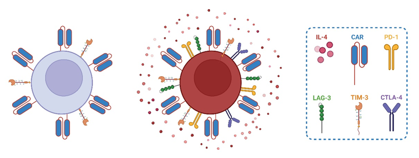 Figure 1. Summary figure showing a non-exhausted CART cell (left) and a CART cell that has developed exhaustion after being exposed to an abundance of IL-4 (right).