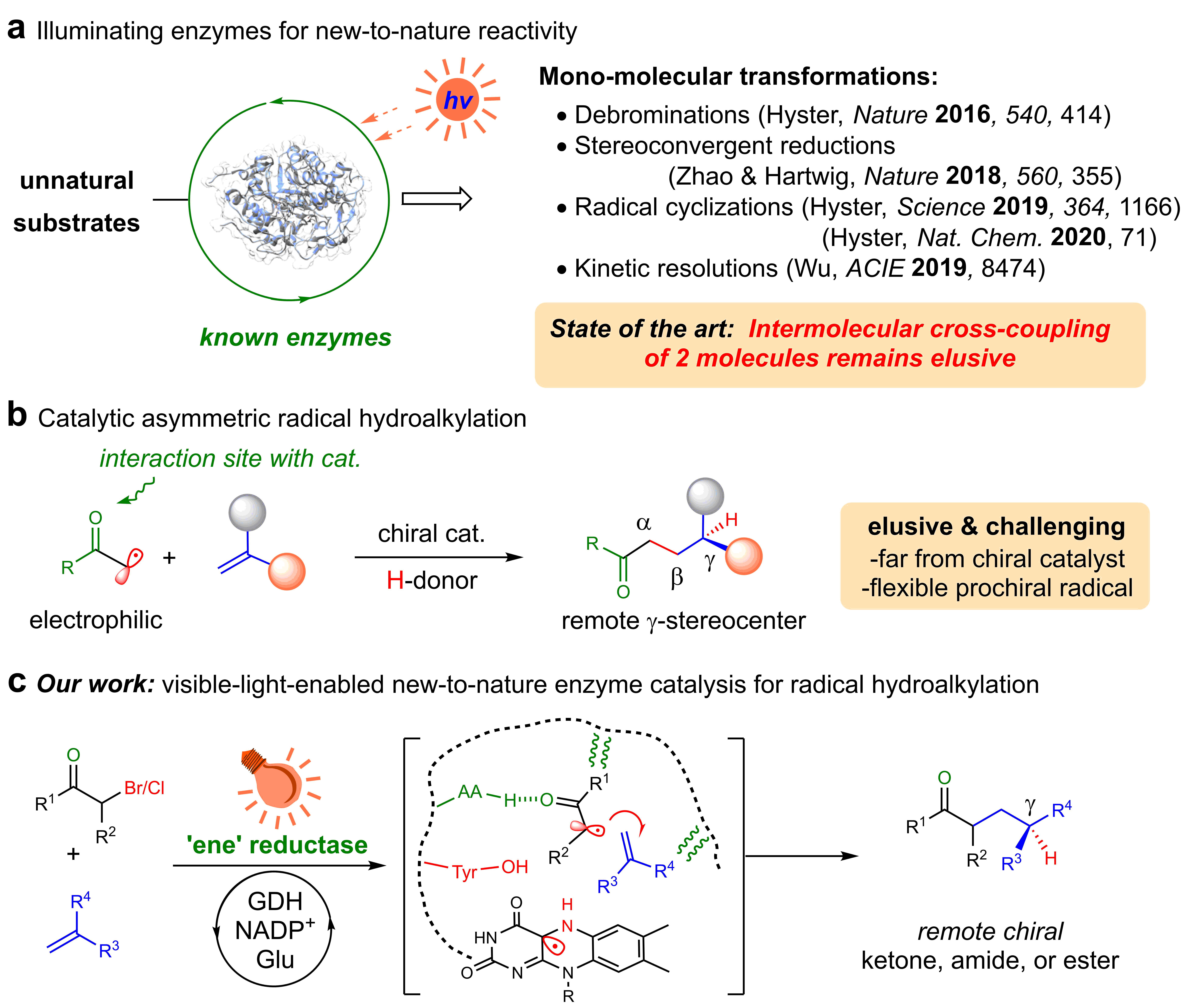 The key to this “all-in-one photoenzymatic catalysis” is the unique property of the ‘ene’ reductase. It forms the key EDA (electron donor-acceptor) complex upon substrates complexation, which serves as visible-light-absorbing antenna and triggers radical process upon light-excitation. The enzyme active site steers the course of radical to an intermolecular reaction pathway with the overall stereochemistry under control.