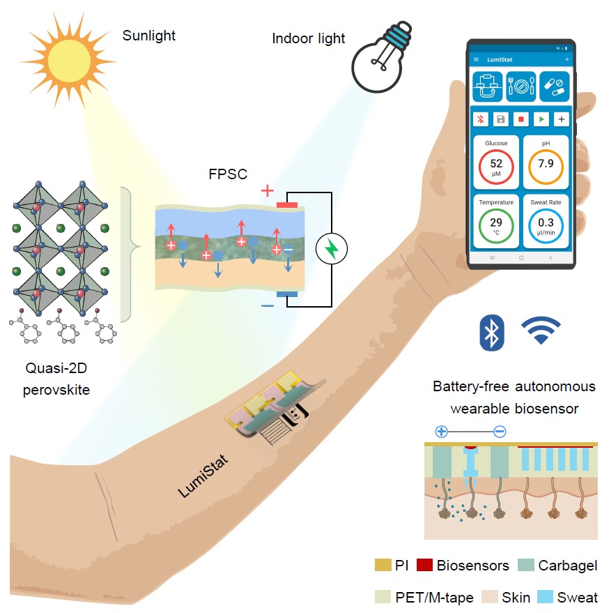 Figure 1. Battery-free wearable device powered by quasi-2D flexible perovskite solar cell for multiplexed wireless biomolecular analysis in varied illumination.