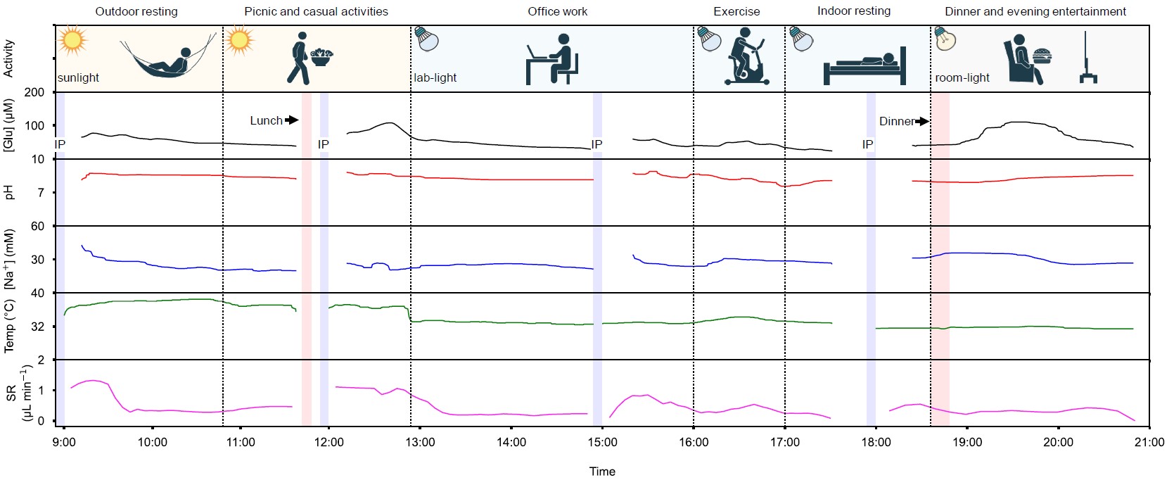 During a day-long, cross-activity multimodal monitoring of sweat biomarkers, LumiStat demonstrated its ability to perform consistently across various lighting environments and physical activities (Figure 2). The device's power consumption was intelligently adapted based on the available illumination, ensuring continuous sensor measurements. This extended, real-life trial further underlined LumiStat's potential for 12-hour operation, opening up possibilities for continuous health monitoring.
