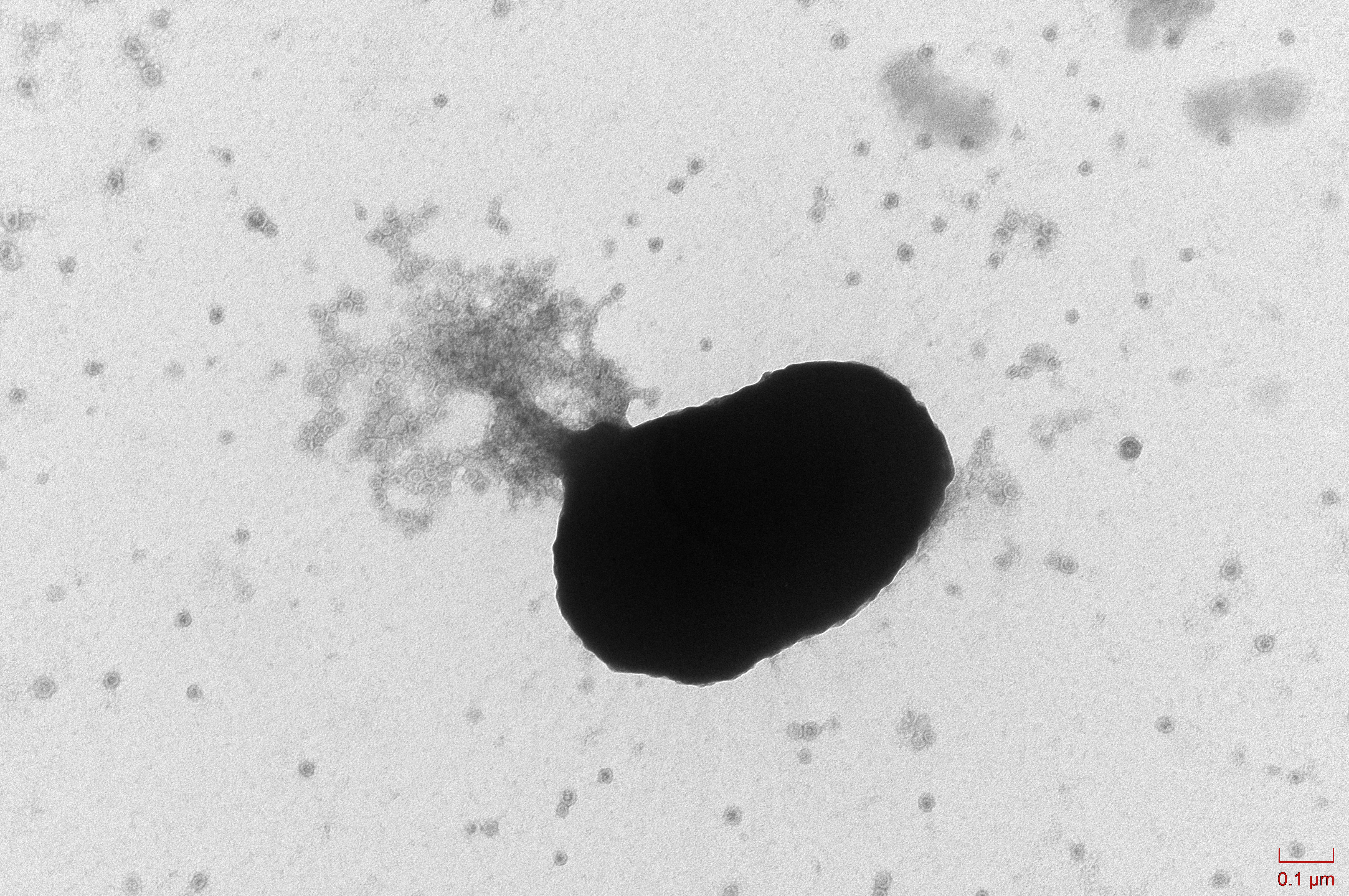 Figure 2. A Halanaerobium cell undergoing viral-induced cell lysis. Viral particles can be seen in the extracellular media.