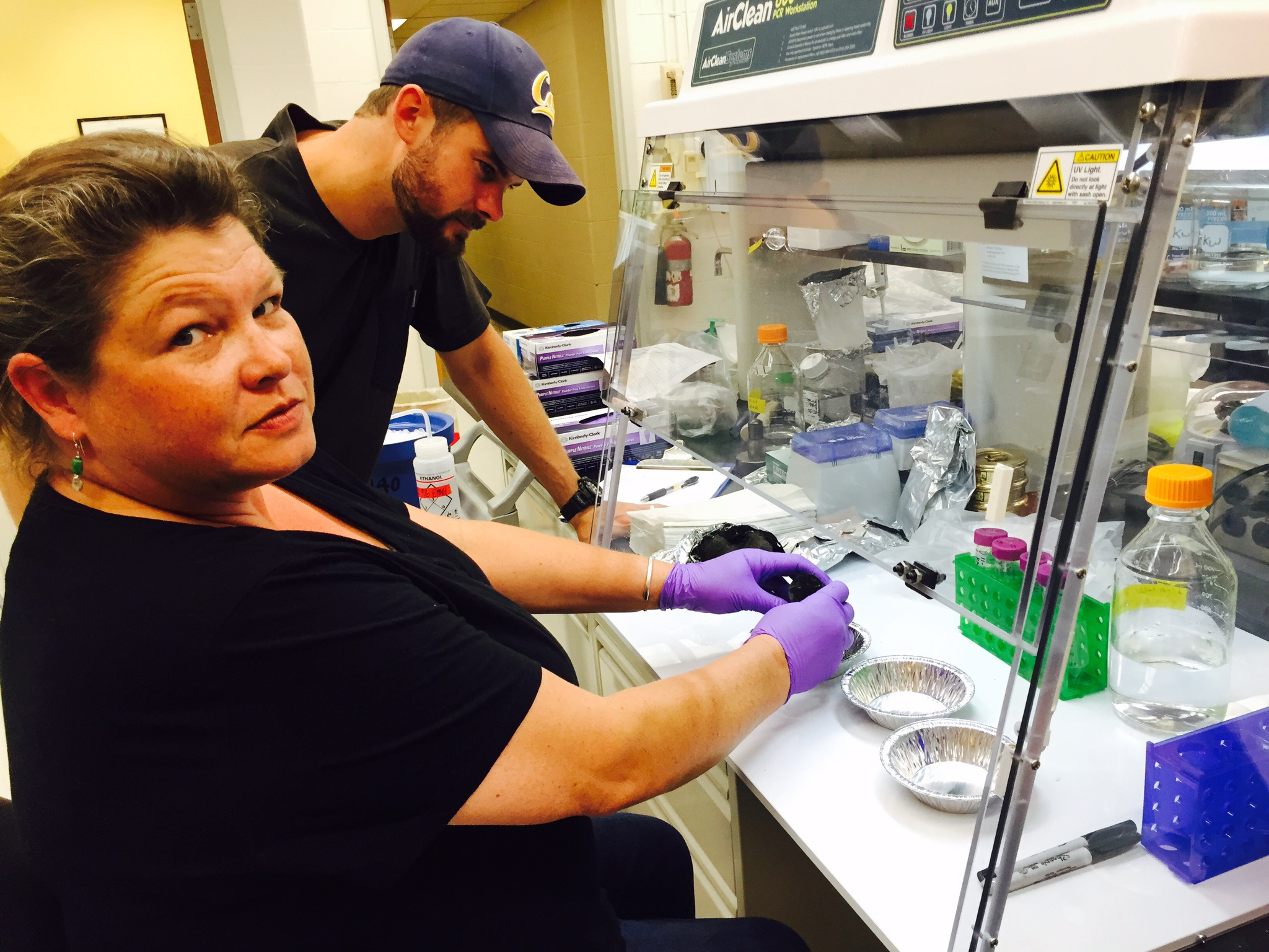 Figure 1. Authors Rebecca Daly and Mike Wilkins working with shale material in the laboratory.