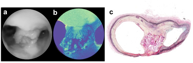 necrotic material to the arterial lumen as showed by histology (c).