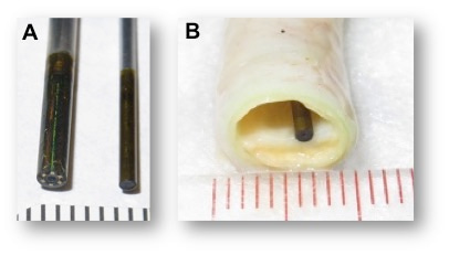 Figure 1 | Scanning fiber angioscopes can have an outer diameter of 2.1 mm (left in A) or 1.2 mm (right in A), and are introduced within arteries (B).