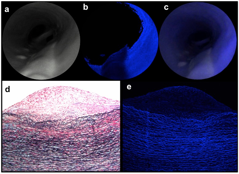 elastin in the tunica media, as shown in confocal microscopy (e).