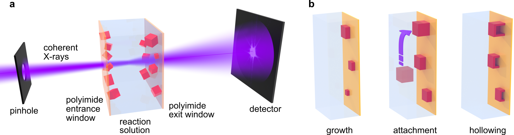 Figure 1. Illustration of the in situ microscopy experiment. a For ptychographic imaging, the reactor containing growing Cu2O nanocubes is raster-scanned through a focused coherent X-ray beam. Diffraction patterns are recorded in the far field for image reconstruction. b Illustration of the growth and hollowing of substrate-bound nanocubes.