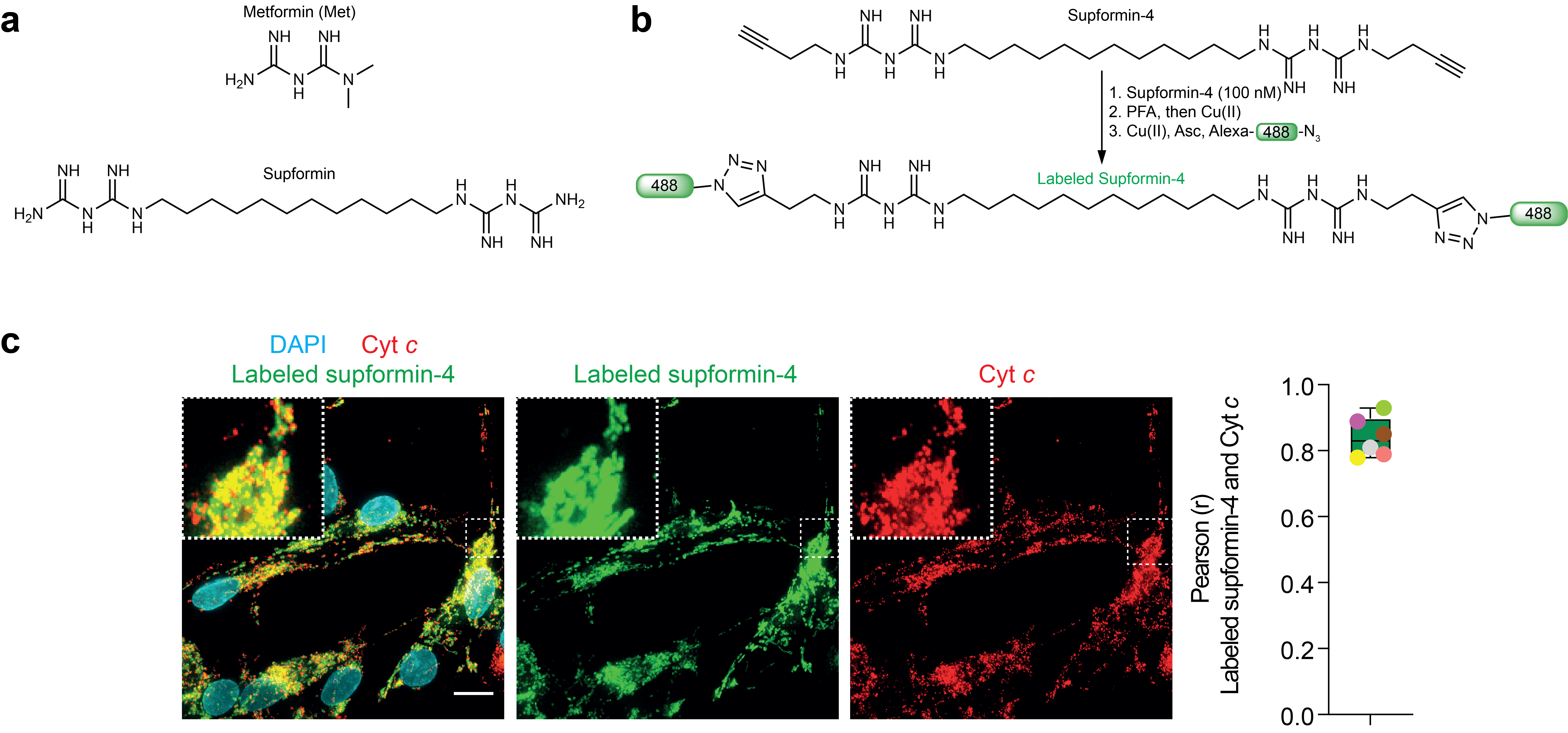 Marmycin A is fluorescent but most small molecules are not and they have to be adapted to be detected in cells. One strategy is to label them with fluorophores. However, adding fluorophores directly to a small molecule, which are often bigger than the molecule itself, can change their cellular localisation. One trick is to introduce a small pretty inert chemical group on a small molecule such as an alkyne. This can then be used to react fluorophores onto the molecule after cell fixation, thus, limiting the influence on cellular localisation. The Nobel Price in Chemistry 2022 was awarded to Carolyn R. Bertozzi, Morten Meldal and K. Barry Sharpless. We extensively reviewed this approach in Nature Reviews Chemistry3. We identified salinomycin to target lysosomes in a study in 20176. Below an example of our recent publication in Nature, showing that the metformin derivative supformin accumulates in mitochondria (labelled with cytochrome c).