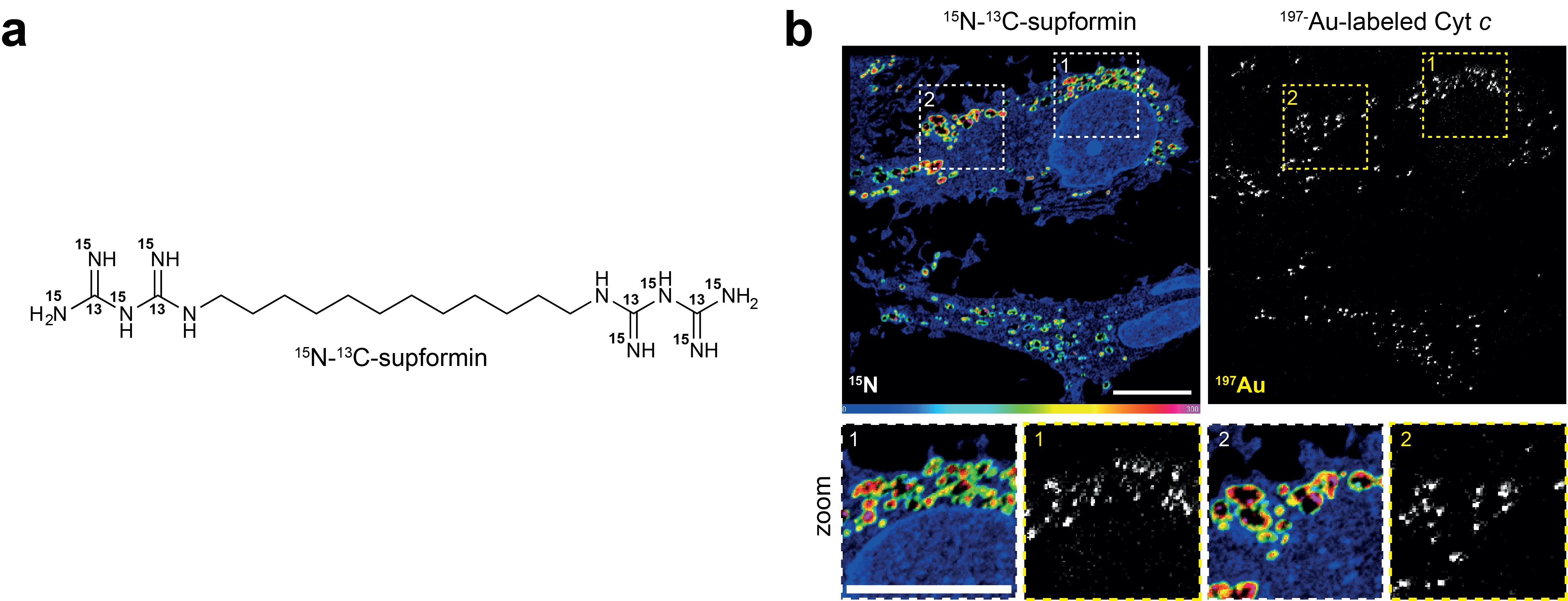 In this study we also applied another approach, using an isotopologue of supfomin and imaging this with NanoSIMS (nanoscale secondary ion mass spectrometry). This is essentially a mass spectrometry approach to image distributions in cells. For this, samples are fixed and prepared akin to samples for electron microscopy. Unfortunately, these machines are expensive and only few exist in the world. We are fortunate to have this technology at Institut Curie, who are also open for external collaborations. Here, we used a gold labelled antibody against cyt c to label mitochondria and then imaged gold and a 15N-13C-supformin isotopologue. We previously employed NanoSIMS in 2020 to detect iron increase in mesenchymal cancer cells during epithelail-to-mesenchymal transition5.