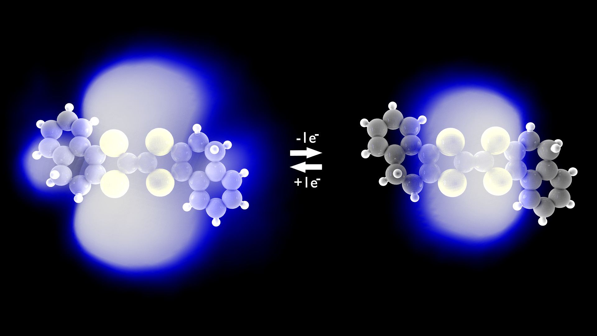 Change in the electronic orbital of a single molecule upon charging. Blue and white represent the experimentally measured electron distribution of the neutral (left-hand side) and charged (right-hand side) molecule superimposed to its chemical structure. One can see that upon removal of one electron (from left to right) the electronic orbital shrinks considerably in size. © L. Patera & J. Repp