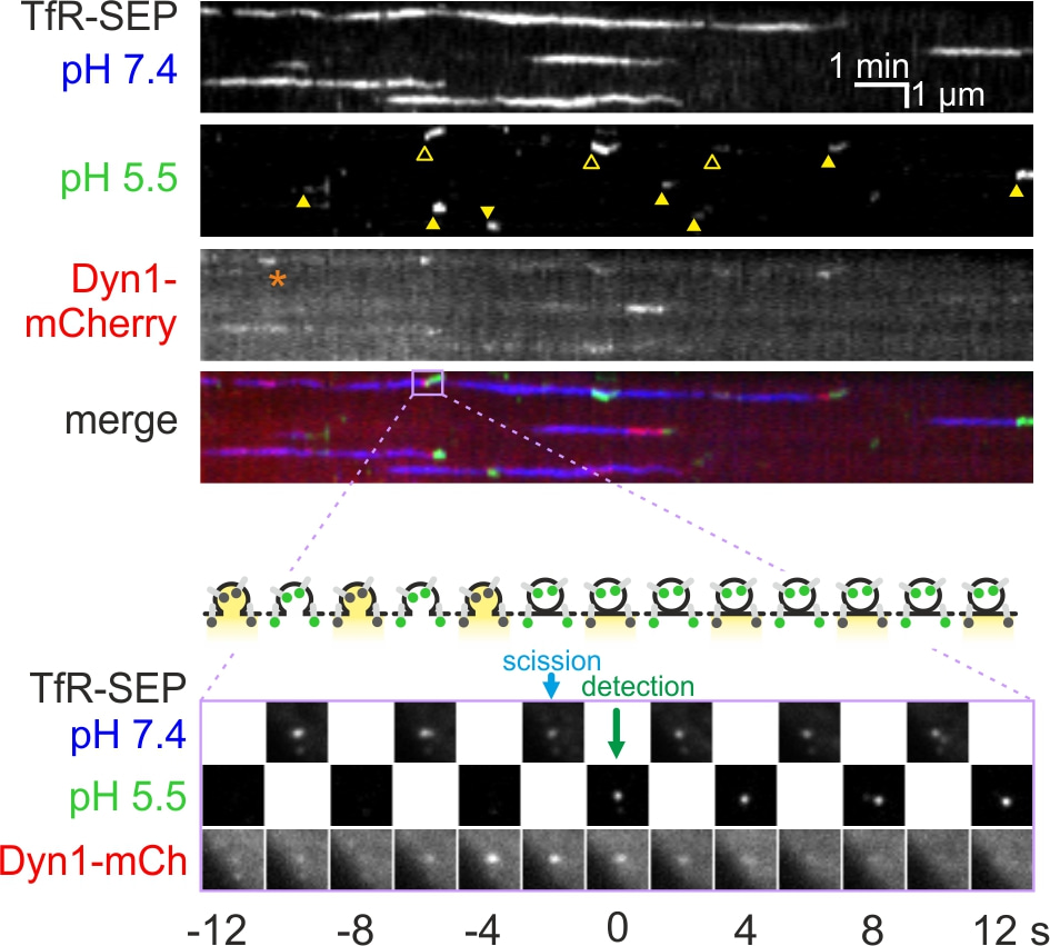 Detection of scission at clathrin coated pits. Top, kymographs of a cell co-transfected with TfR-SEP and the endocytic protein dynamin1 (Dyn1-mCherry). The top kymograph (TfR-SEP at pH 7.4) shows the appearance and disappearance of CCPs. Each CCP remains visible for more than a minute. Middle kymograph (TfR-SEP at pH5.5) shows the CCVs formed at the CCPs (yellow arrowheads). Some are associated with CCP disappearance (filled arrowheads) but for others the CCP remains visible (open arrowheads). CCV appearance is associated with the recruitment of Dyn1-mCherry a few seconds before. Bottom kymograph, the three "channels" merged. Bottom, close up view of one scission event (framed in the lila rectangle in the merge kymograph). On top, scheme of the Forming CCV with fluorescent TfR-SEP at pH 7.4 (green lollipops) and non-fluorescent TfR-SEP at pH 5.5 (black lollipops). After scission, TfR-SEP trapped in the CCV remain fluorescent when the cell is bathed in pH 5.5 solution, for the first time at frame 0 s labelled "detection". It reveals that vesicle closure occurred when extracellular pH was at 7.4, around time -2 s, "scission".