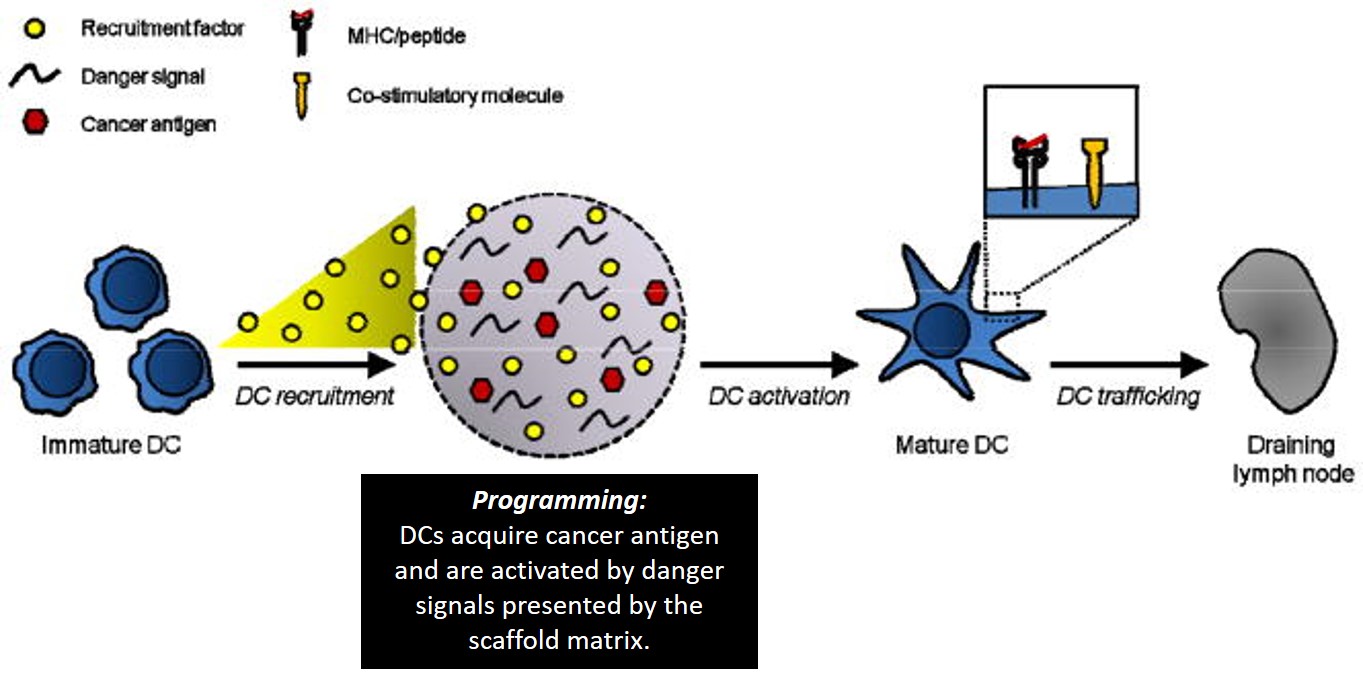 These biodegradable aAPCs represent pioneering work in immunomaterials for therapeutic and investigative applications. Additionally, microenvironments can be engineered to program dendritic cells (DCs) to initiate a T cell response; as therapeutic cancer vaccines. This was investigated with highly porous scaffolds, similarly fabricated from biodegradable copolymer PLGA (poly[lactide-co-glycolide]), integrated with bioactive molecules to recruit DCs. Inside the engineered microenvironment or matrix, DCs acquire cancer antigens, to present acquired peptides on cell surface MHC molecules, initiating a T cell response in vivo thereafter (Fig 4). A 90% survival rate was achieved in mice with melanoma via melanoma-antigen-specific T-cell generation, indicating a promising cancer vaccine6. This ground breaking potential is now being tested in clinical trials as a personalized cancer vaccine with human melanoma patients5.