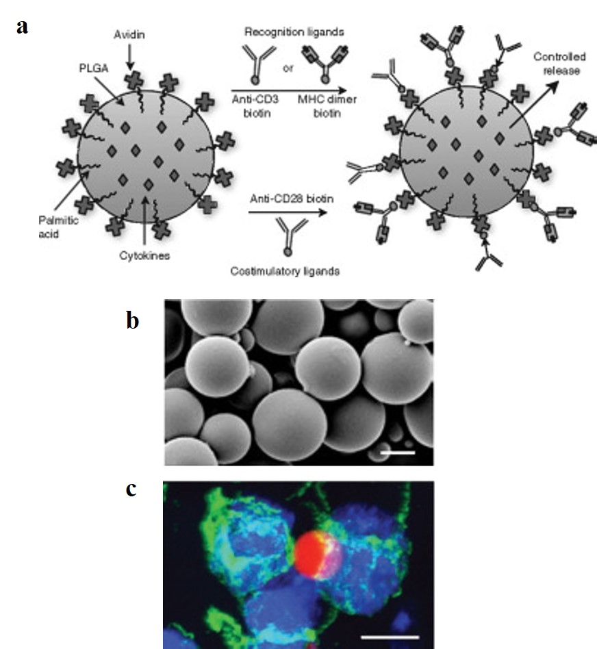 To accurately engineer artificial antigen presenting cells (aAPCs) that normally facilitate T-cell activation; biological recognition signals (peptide-major histocompatibility complex-MHC) and stimulatory signals should be incorporated to the biodegradable platform. Particles can be fabricated in the micro/nanometer scale from poly(lactide-co-glycolide) (PLGA) polymers, whose safety in humans has been ensured11. Based on the high-affinity binding between avidin and biotin; avidin was immobilized on particle surfaces during synthesis, for attachment of biotinylated MHC dimers and antibodies, for recognition and co-stimulation of T cells. The particles were then characterized with scanning electron microscopy (SEM) and qualitatively visualized to observe stable interactions with T cells (Fig 3 a-c).