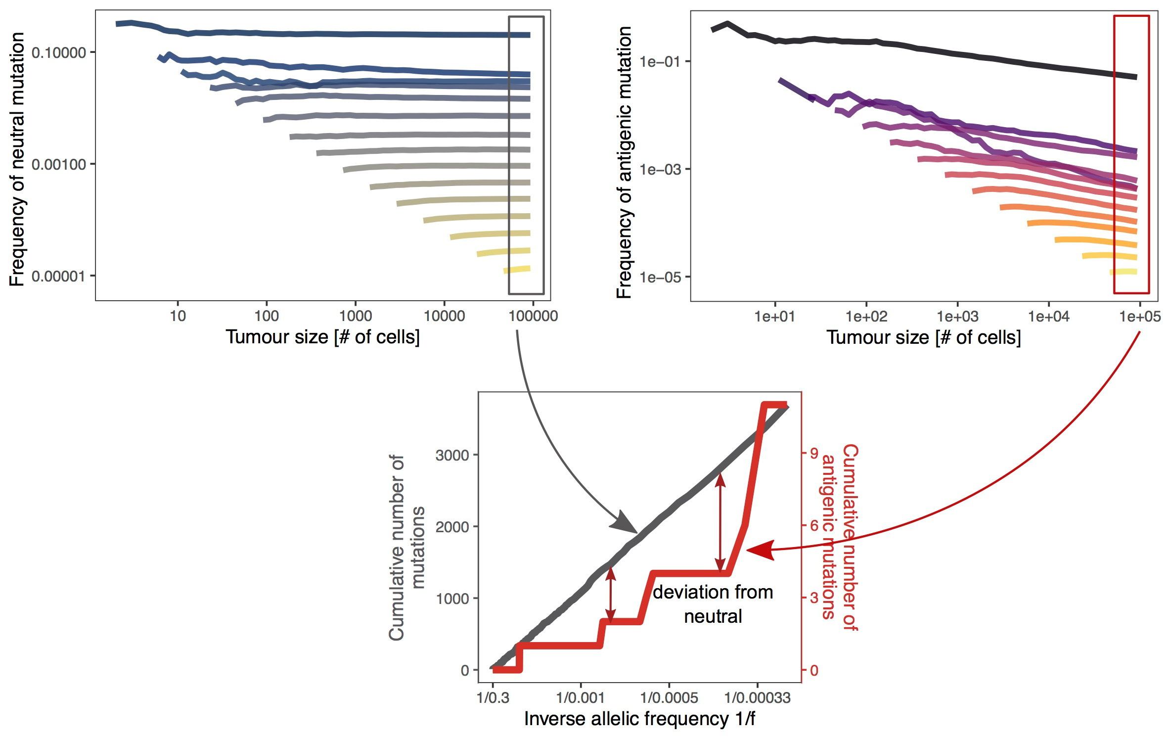 We observed that the proportion of the tumour carrying an antigenic mutation declined during tumour growth - since cell with such mutations had a higher probability to be killed and got outgrown by their wild-type (neutral) counter-parts. This is exactly the process of immuno-editing: consistently pruning cells that would tip off the immune system. In the final tumour population, this led to a "gap" in the frequencies of antigenic mutations: while neutral mutations were distributed evenly, negatively selected mutations were more concentrated on the rare end of the spectrum. This relationship showed up clearly when plotting the cumulative number of mutations against their inverse frequency in the tumour population, creating a characteristic "dip" in the graph. (Which was, reassuringly, in agreement with population genetics results, e.g. Cvijovic et al., 2016.)