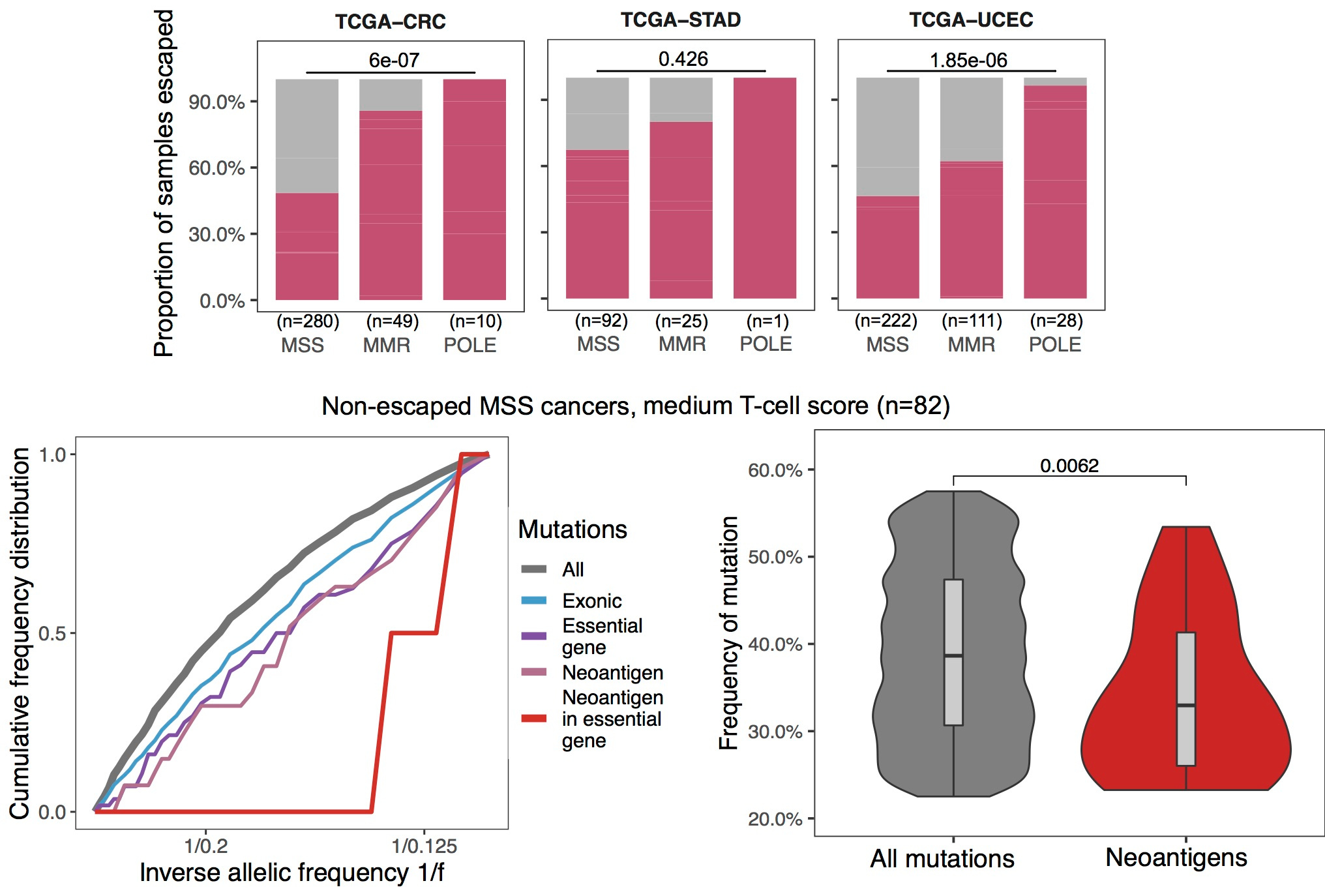 So what is the landscape of real cancer samples like? We analysed colorectal (CRC), stomach (STAD) and endometrial (UCEC) cancers from The Cancer Genome Atlas and found that immune escape was an extremely wide-spread phenomenon, especially amongst cancers with a high mutation load due to mismatch repair (MMR) or polymerase epsilon (POLE) deficiency. Following our model predictions, we evaluated negative selection on a select subset of these cancers: without immune escape, not hyper-mutated (microsatellite stable, MSS) and showing an intermediate level of T-cell infiltration that suggested medium-level immune selection. We pulled all cancers into one mutation cohort, and this way we could capture sufficient mutations to see a deviation between the total mutation spectrum and neoantigens-associated mutations, confirming that indeed these mutations are experiencing negative selection.