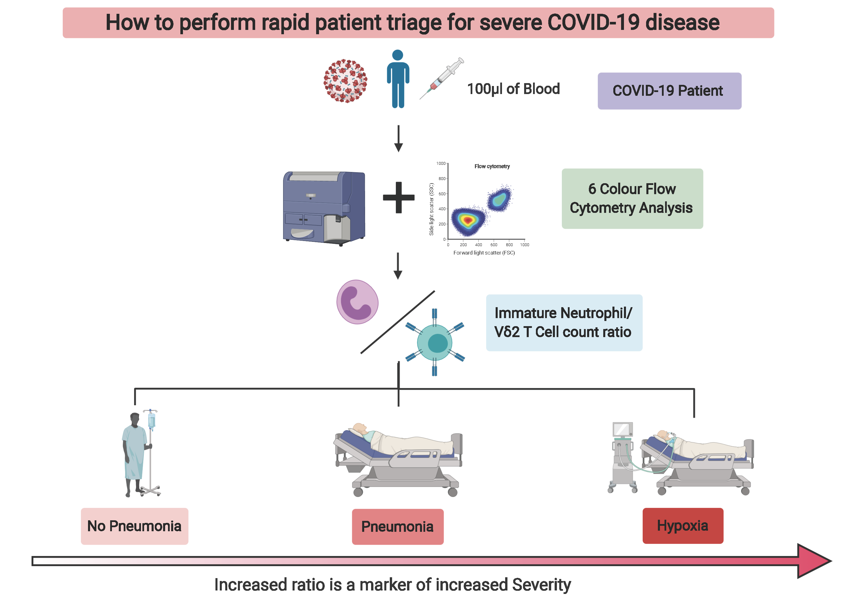 Out of all the subsets we identified, the most interesting were the immature neutrophils and gamma delta 2 T cells (VD2 cells). These particular immature neutrophils increased in spectacular fashion in the blood of patients with high disease severity, while VD2 T cells showed a granular decrease which followed severity with a low standard deviation. We then looked at these cell numbers in patient samples at early time points after diagnosis. That was when we realized that we had found something that could prove useful in the clinical setting to potentially predict if patients will develop severe symptoms of pneumonia or hypoxia, and decide to preventively admit and/or treat them accordingly (Figure 2).