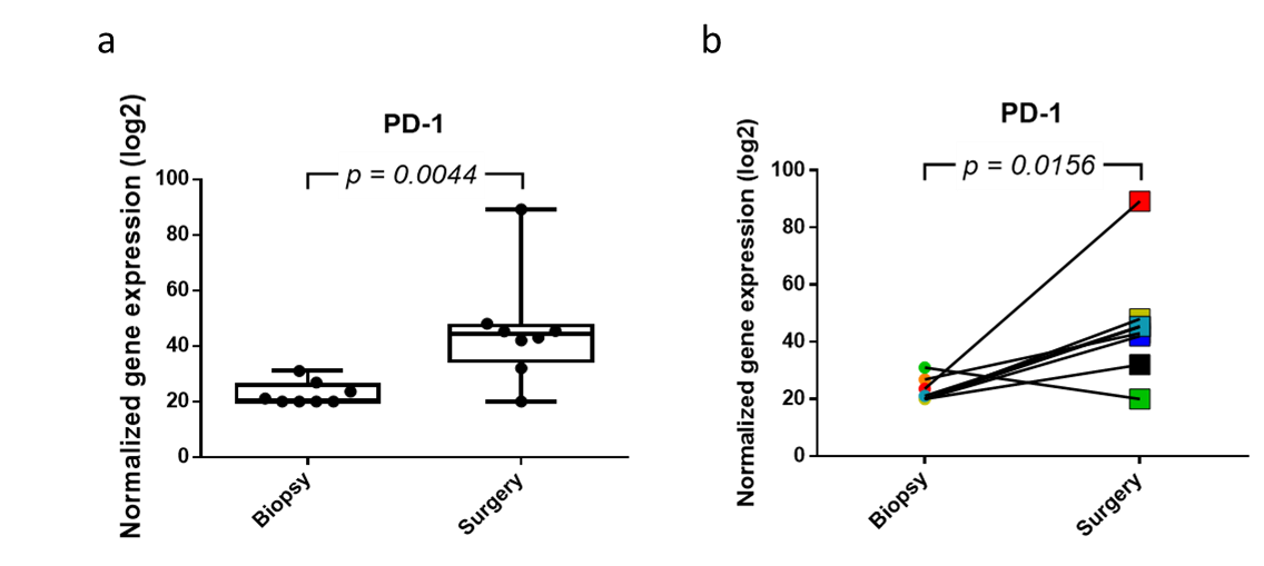 Figure 4. Normalized gene expression of PDCD1 (PD-1) before and after NACT. NACT causes a significant increase in PD-1 expression. a) Plot of PD-1 expression in which the value for each EOC sample is shown. b) Line graph representing the increase in PD-1 expression in paired biopsy-surgery samples. Each line represents an EOC patient.