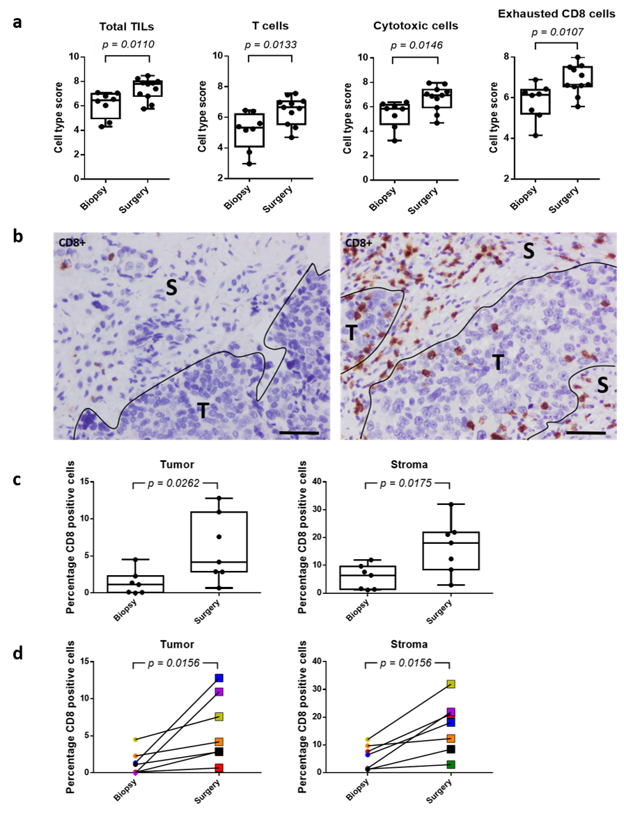 Figure 3. NACT enhances immune cell abundance and CD8+ cell infiltration in both tumor and stromal areas of the EOC sample. a) Different immune cell subsets show increased abundance in surgery samples after NACT. b) Immunohistochemistry showing the presence of CD8+ cells in EOC sample before (left) and after (right) NACT. S stroma, T tumor. Scale bars, 100 μm. c) Plot of percentage of CD8+ cells in tumor and stromal areas before (biopsy) and after (surgery) NACT. d) Line graph representing the percentage of CD8+ cells in tumor and stromal areas in paired biopsy-surgery samples. Each line represents an EOC patient, with colors defining the same patient in both analyses.