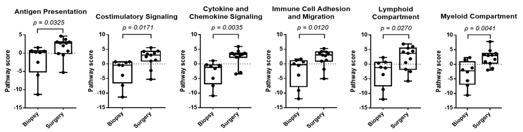 Figure 2. Increase of inflammatory signature in EOC surgery samples from patients with no/partial response to NACT. Several pathways associated to immune regulation are stimulated by NACT.