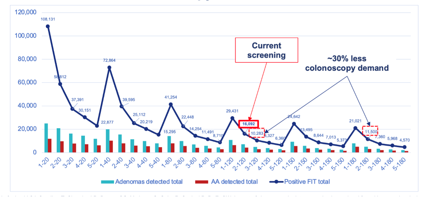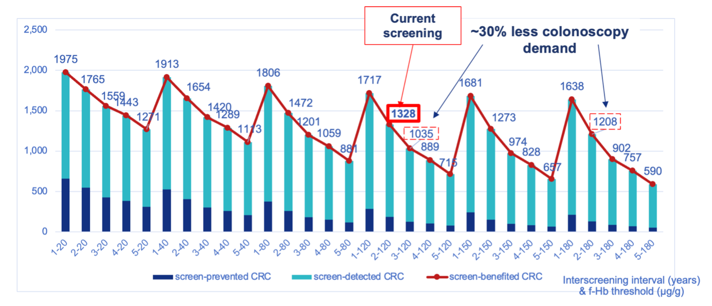 The screening service, particularly the colonoscopy capacity is stretched by recovering from the COVID-19 pandemic, additional hygiene procedures to minimise risk of transmitting COVID-19, and the recent move to a lowered starting age of between 50 to 60 years (depending on local resources). It may be timely to consider other screening options, starting with estimating the impact of alternative intervals between screens and/or f-Hb thresholds for FIT positivity, to identify options to minimise effects of increasing demand and/or restrictions in capacity.