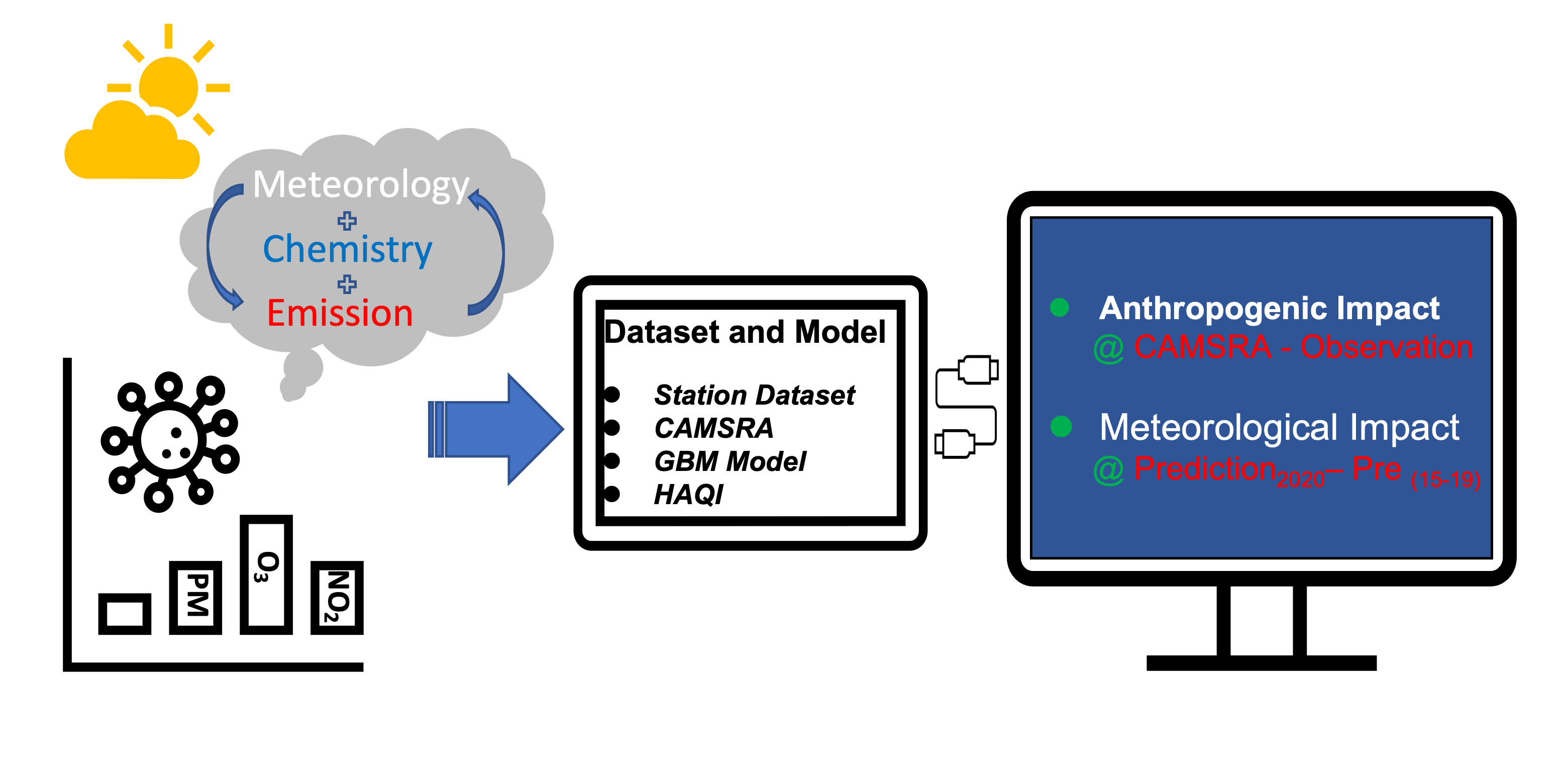 In this study, the stational observation dataset and the Copernicus Atmosphere Monitoring Service Reanalysis (CAMSRA) dataset with a fixed emissions inventory (which represents a counterfactual to the world having experienced observed emissions reductions) were used to explore the different anthropogenic drivers. The Gradient Boosting Machine (GBM) model, driven by surface meteorological variables, was executed to investigate the meteorological drivers. Finally, a HAQI model was applied to calculate the relative health risks.