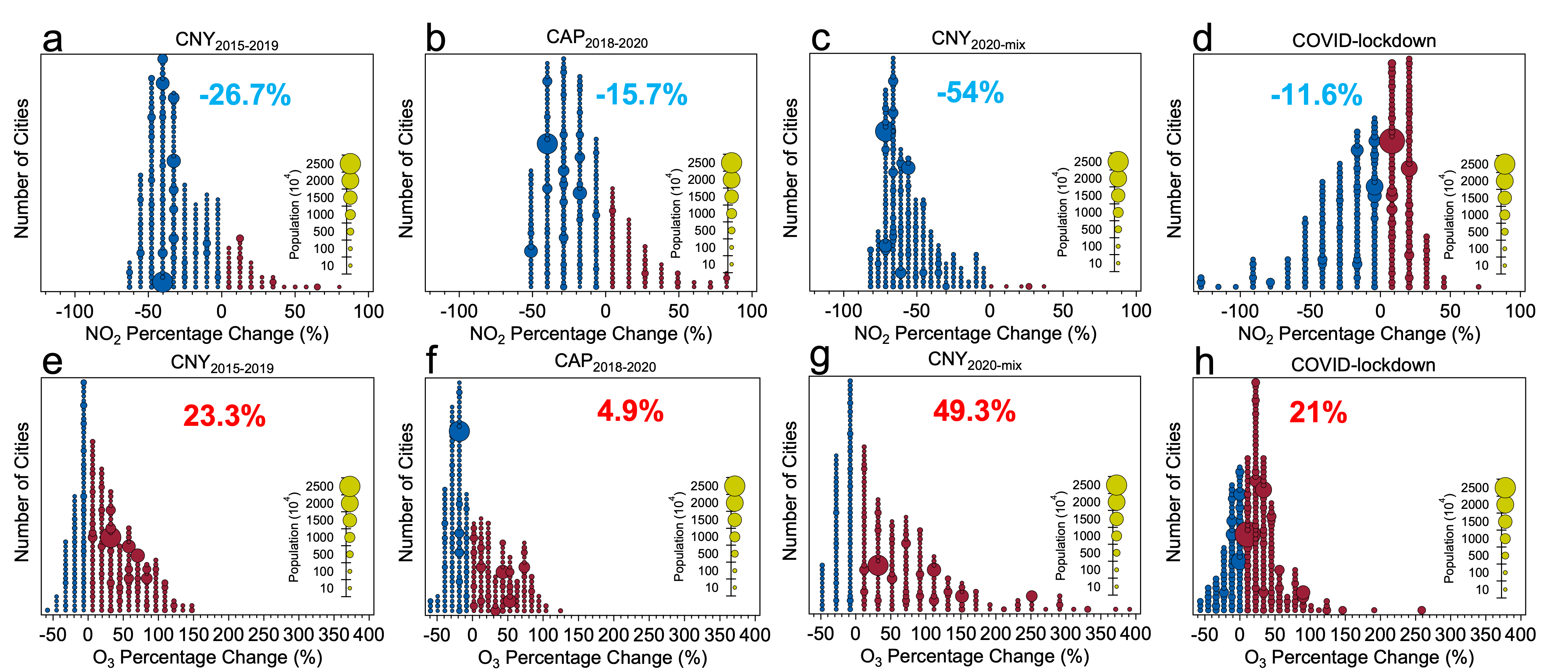 Our study reveals that the CNY reduces NO2 concentrations on average by 26.7% each year, while the COVID lockdown measures have led to an additional 11.6% reduction in 2020, and the CAP to a reduction in NO2 by 15.7%. On the other hand, meteorological conditions led to increases in NO2 of 7.8%. Neglecting the CAP and meteorological drivers thus leads to an overestimate and underestimate of the effect of the COVID lockdown on NO2 reductions, respectively. For O3 the opposite behavior is found, with changes of +23.3%, +21.0%, +4.7%, and -0.9% for CNY, COVID lockdown, CAP, and meteorology effects, respectively. The effect of ozone increase was more than compensated for by the decreases in PM and NO2 in the HAQI calculation. As a result, the total effects of these drivers show a drastic reduction in multi-pollutant related health risks across China, with meteorology affecting particularly the Northeast of China adversely. Importantly, the CAP’s contribution highlights the effectiveness of the Chinese government’s air quality regulations on NO2 reduction.