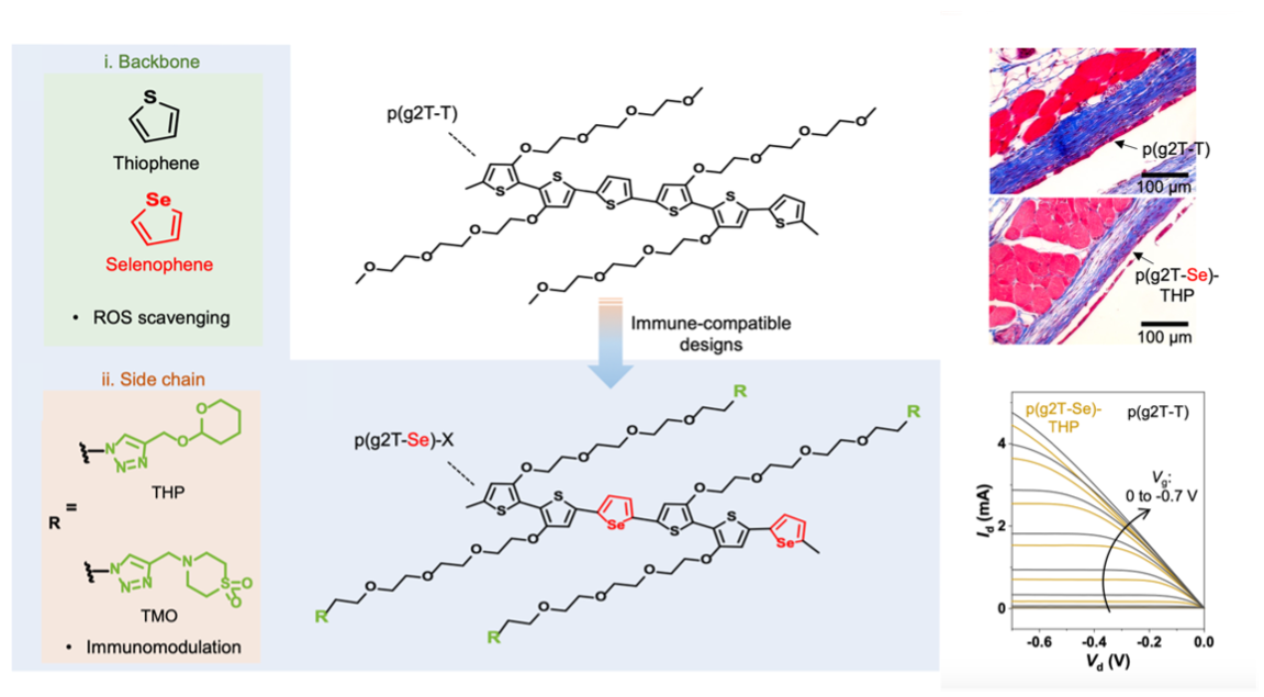 We integrated selenophene into the polymer backbone as a replacement for thiophene, a strategy shown to simultaneously promote immune compatibility and maintain high electrical performance. In parallel, drawing inspiration from immunological studies highlighting the immunomodulatory functional groups, we incorporated such moieties (THP and TMO) into the side chains of semiconducting polymers to suppress FBR. Using the well-characterized p(g2T-T) as the starting polymer to implement these designs, we show a substantial reduction in FBR, as evidenced by a 68% decrease in collagen density around the implants (Fig. 2).