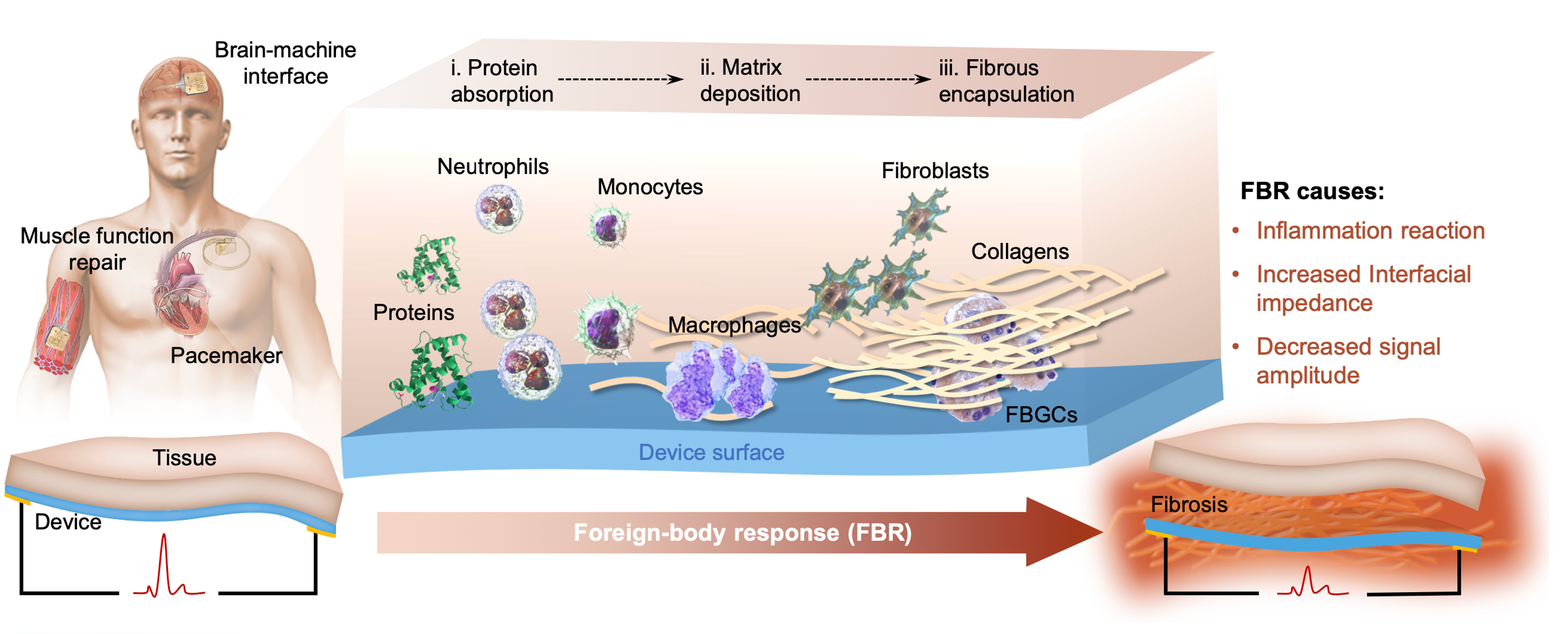 Figure 1. FBR processes on common types of implantable devices, and the negative influences