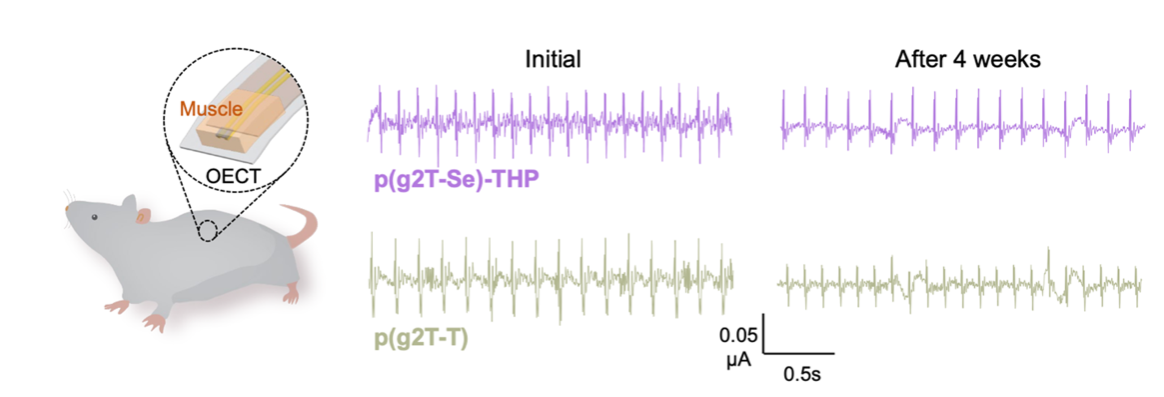 We demonstrated that the immune-compatible semiconductor designs maintained excellent electrical performance in organic electrochemical transistor (OECT) devices. Notably, the incorporation of a selenophene backbone resulted in higher charge carrier mobility that reaches 1.2 cm2V-1s-1, and also higher transconductance, compared to the conventional thiophene-based counterpart, underscoring the potential of selenide-containing backbone engineering. We further evaluated the in vivo chronic performance of our materials by comparing the current retention of implanted OECT devices over a three-month period. Taking a step further, we fabricated soft OECT devices based on our semiconducting polymers and successfully demonstrated the chronic use for the recording of electrocardiography (ECG) and electromyogram (EMG) signals in live mice. After four weeks of implantation, the immune-compatible designs maintained significantly higher signal amplitudes, highlighting their promise for chronic bioelectronic applications (Fig. 4).