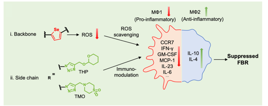 Previously, there had been no rigorous characterizations of FBR behaviors for semiconducting polymers. In order to provide a comprehensive understanding of the FBR-suppressing effects of our design, we carried out a series of systematic immunological assays. In brief, our two strategies were shown to downregulate pro-inflammatory biomarkers and upregulate anti-inflammatory ones, mitigating FBR by suppressing macrophage activation (Fig. 3). Furthermore, this study reveals the immunomodulatory potential of selenophene-based structures, highlighting a promising molecular design approach that leverages elements like selenide to construct conjugated units with intrinsic immune compatibility. The details can be found in our published paper.